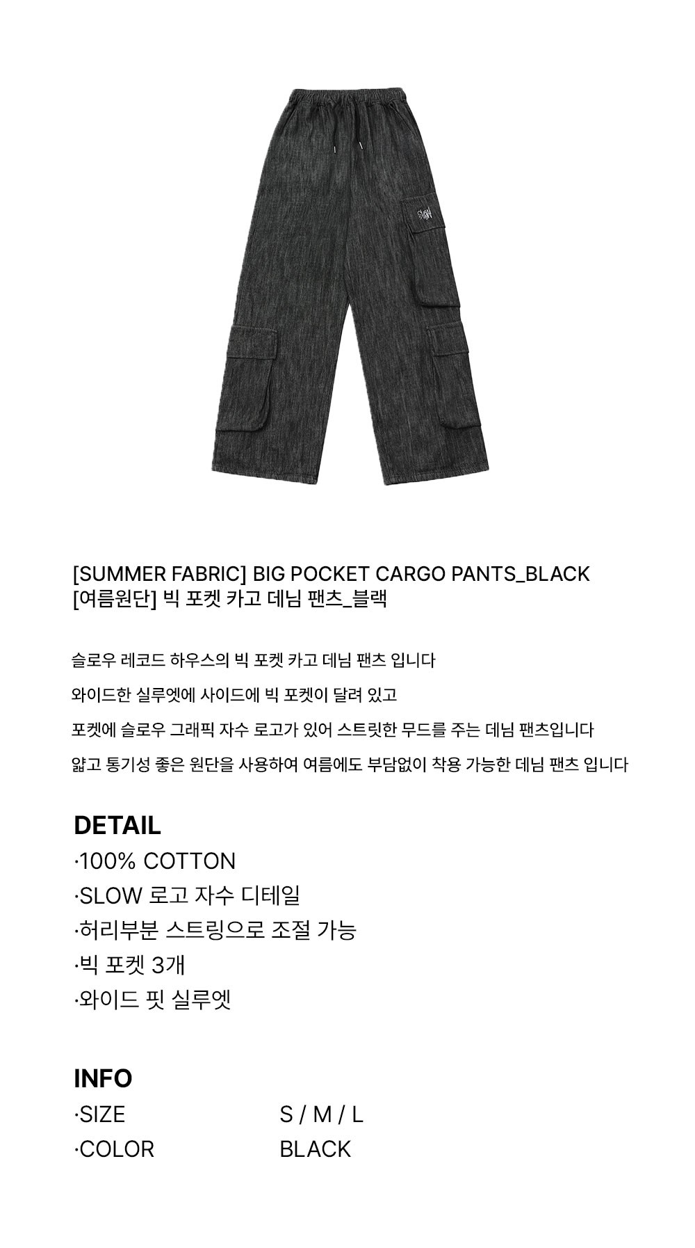 슬로우 레코드 하우스 여름원단 빅 포켓 카고 데님 팬츠 블랙