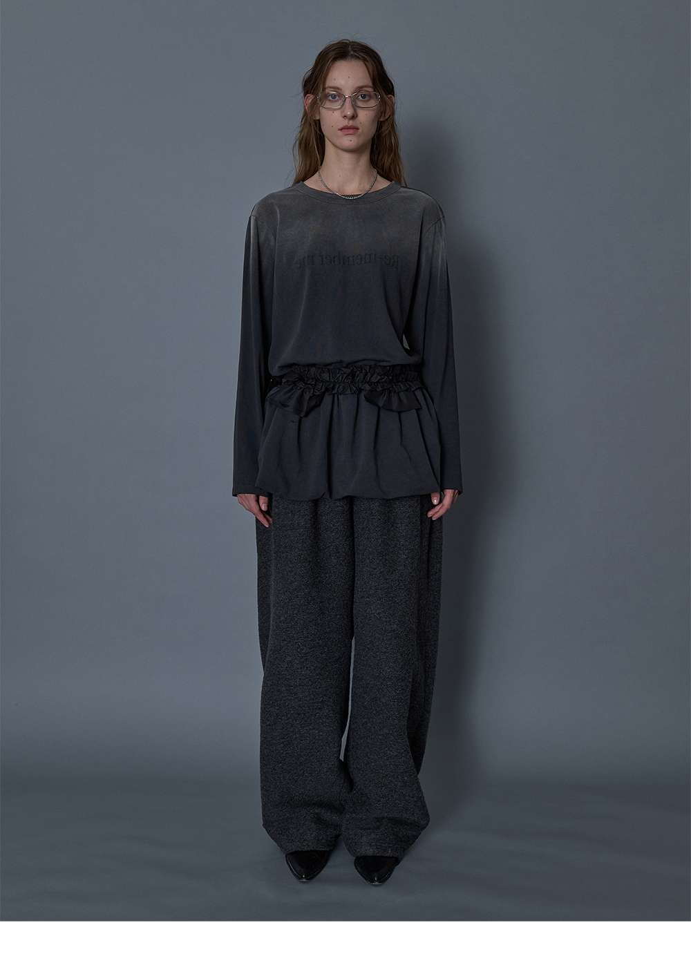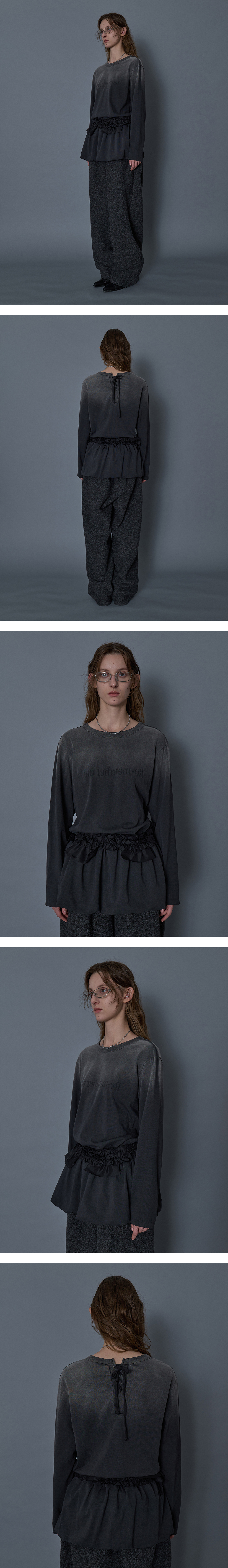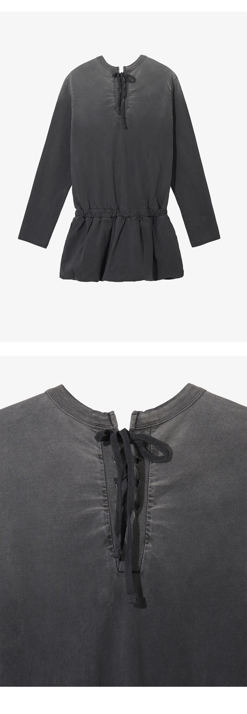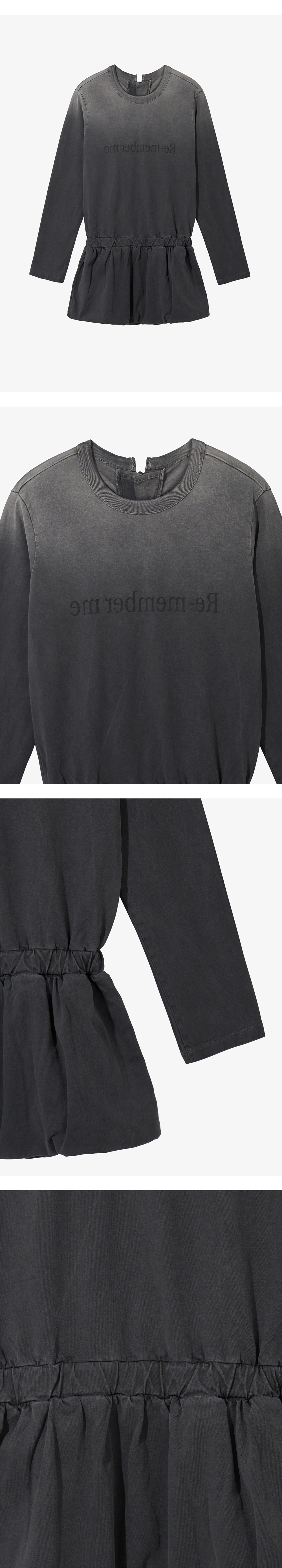 - 전면 Re-memberme 타이포 그래픽 - 허리 밴딩 디테일로 편안한 착용감 - 하단 퍼프 스커트 - 후면 레이스업 디테일 - 피그먼트 다잉 기법 - 상단 더티 워싱 * 175cm and she is wearing size 1 * Shell : 100% Cotton * Made in Korea