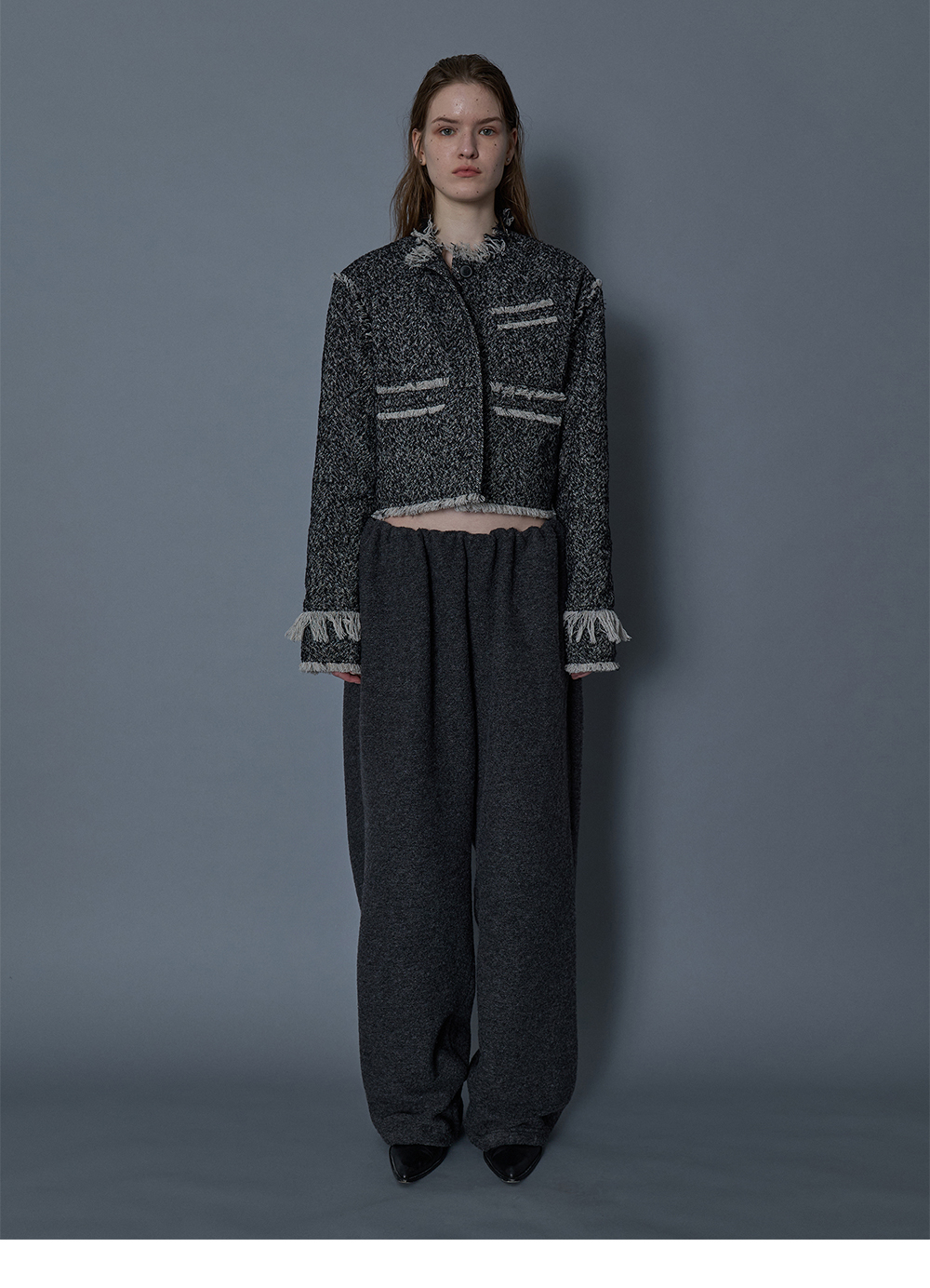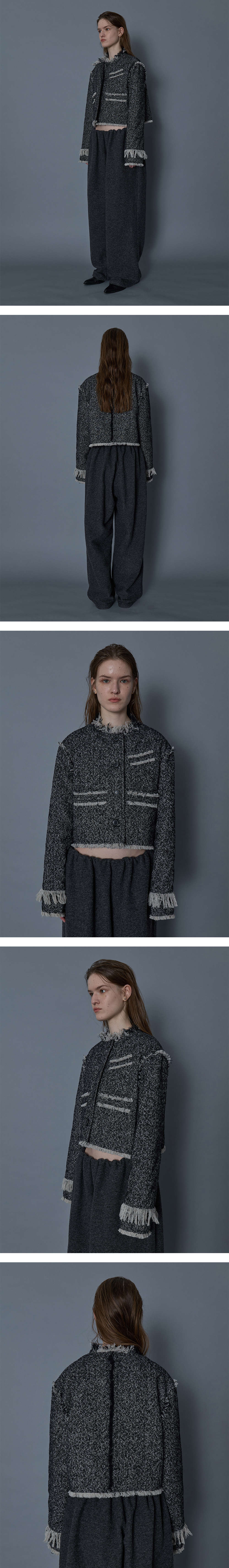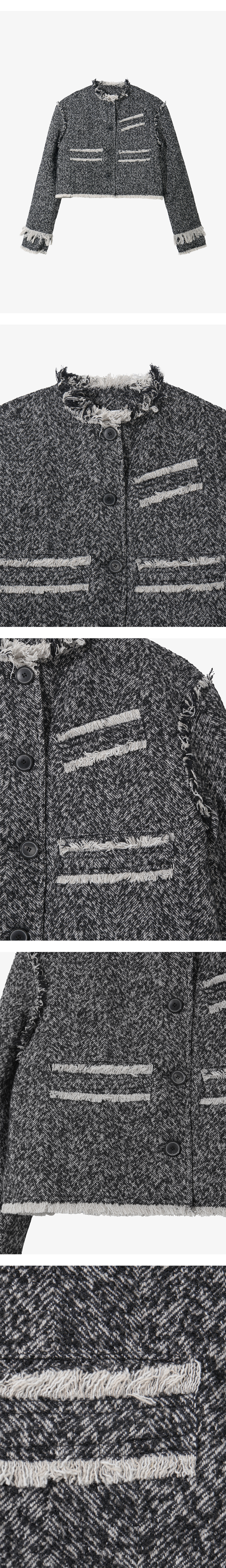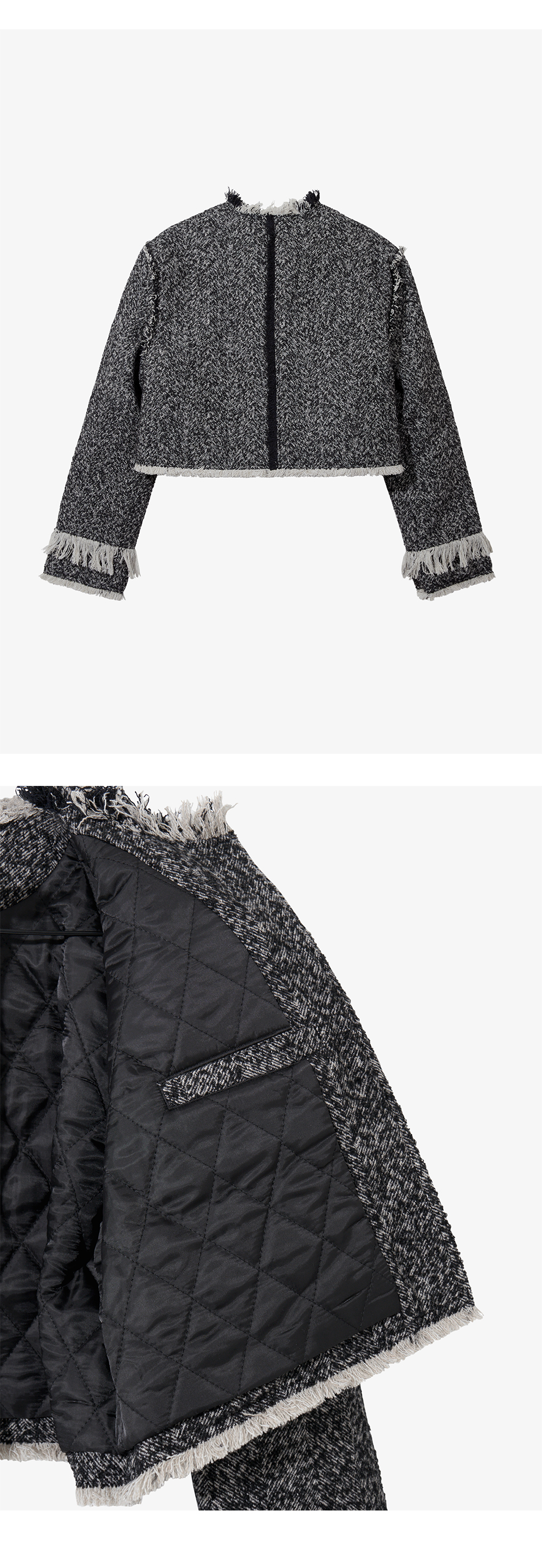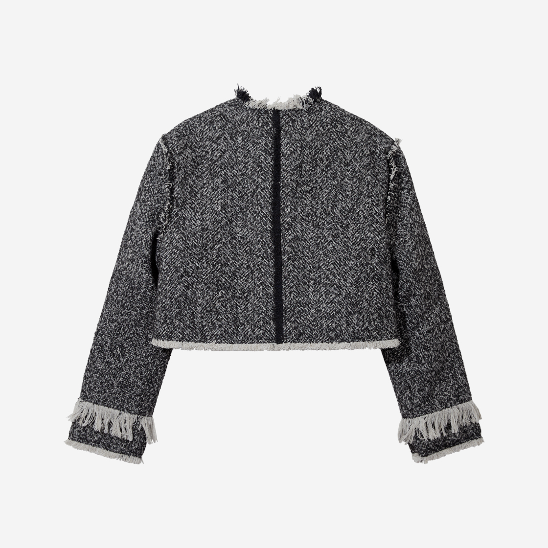 - 프린지 디테일의 트위드 헤링본 자켓 - 전면 3개의 포켓 - 내부 미니 포켓 - 내부 2oz 다이아 퀄팅 안감 - 크롭 기장의 레귤러 실루엣 * 174cm and she is wearing size OS * Shell : 69% Wool, 17% Polyester, 10% Nylon, 4% Recycle - Wool * Lining : 100% Polyester * Made in Korea