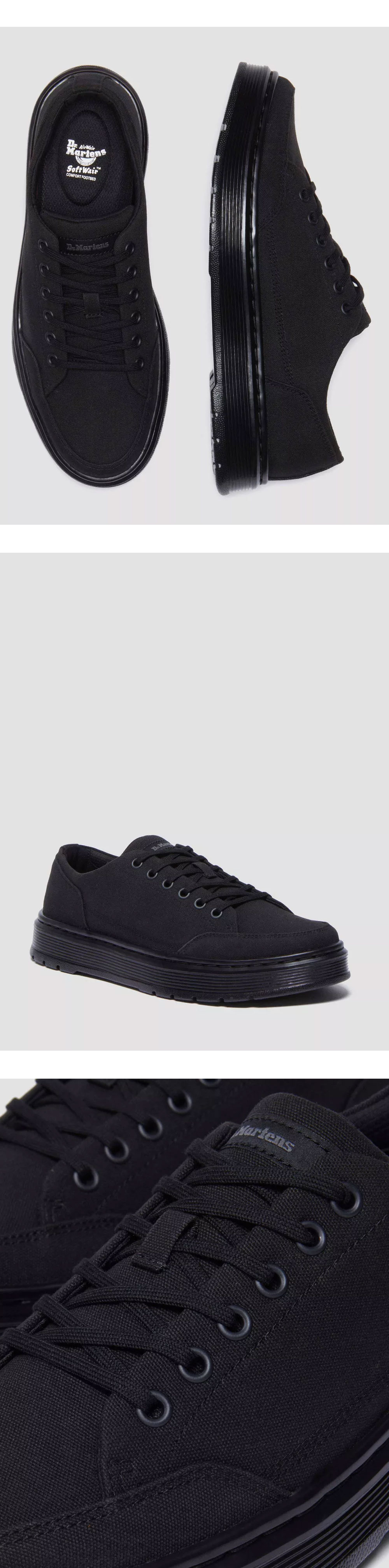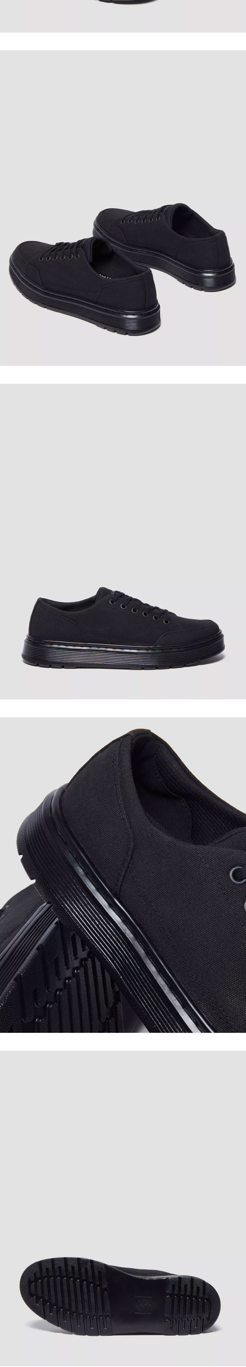 가볍고 통기성이 좋은 닥터마틴의 브루클린 캔버스 블랙입니다. - 올블랙 - 통기성이 좋은 여름용 10온스 캔버스 - 길쭉한 AirWair 백스트랩 - 깔끔한 디자인