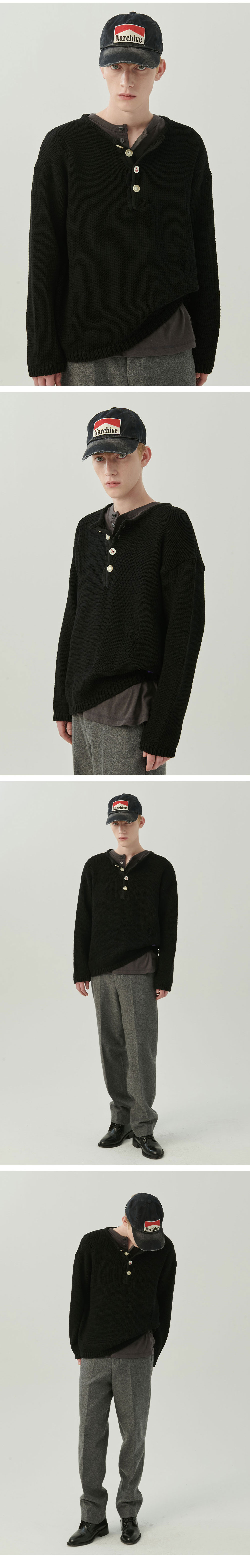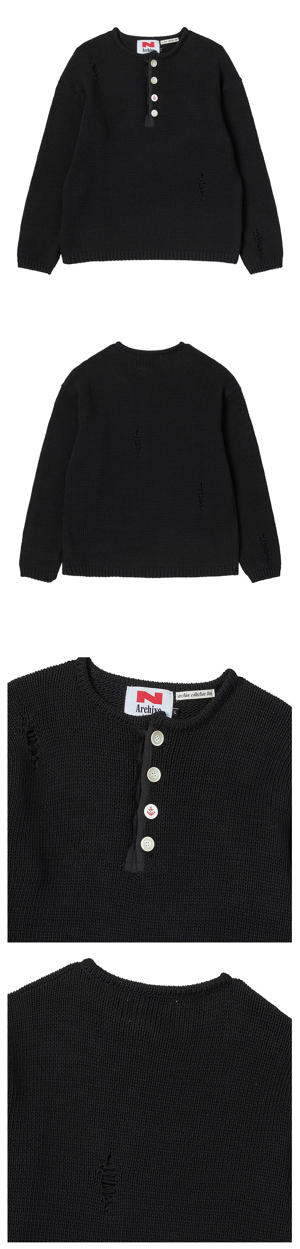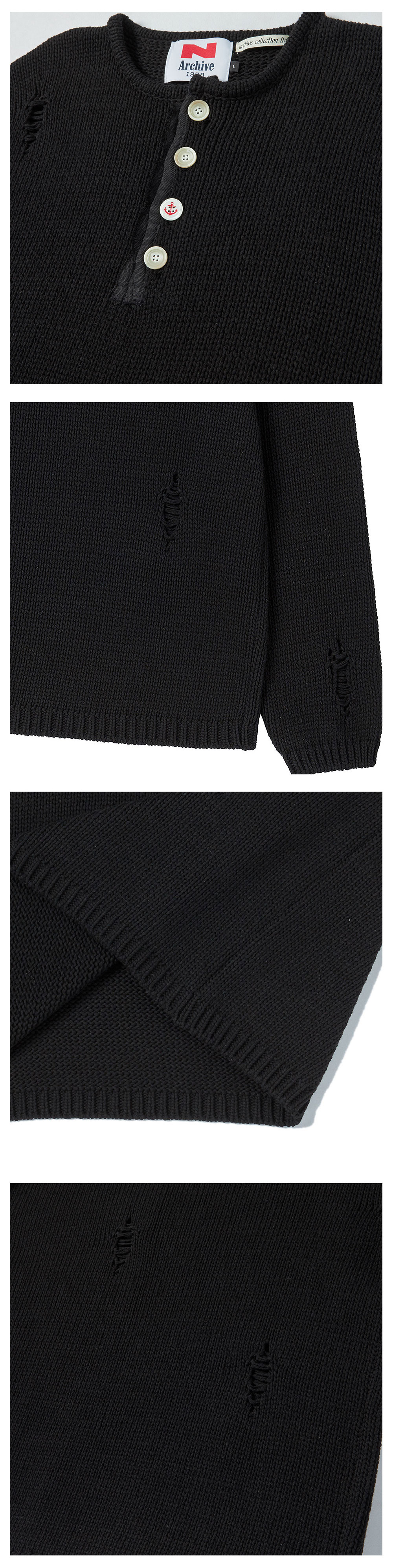 엔 아카이브 아카이브 헤비 웨이트 코튼 데미지 디테일 헨리넥 니트 블랙