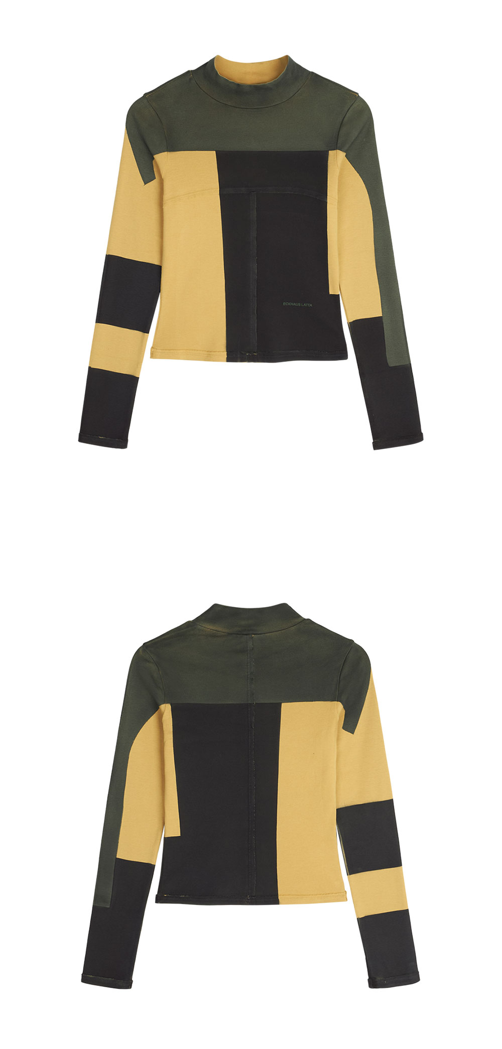 블랙과 버터 옐로우의 조합이 매력적인 에크하우스 라타의 우먼 랩 베이비 터틀넥 리댁티드입니다. - 기하학적 형태의 디테일 - 녹색 로고 스크린 프린팅 - 코튼 100% - Made in Peru