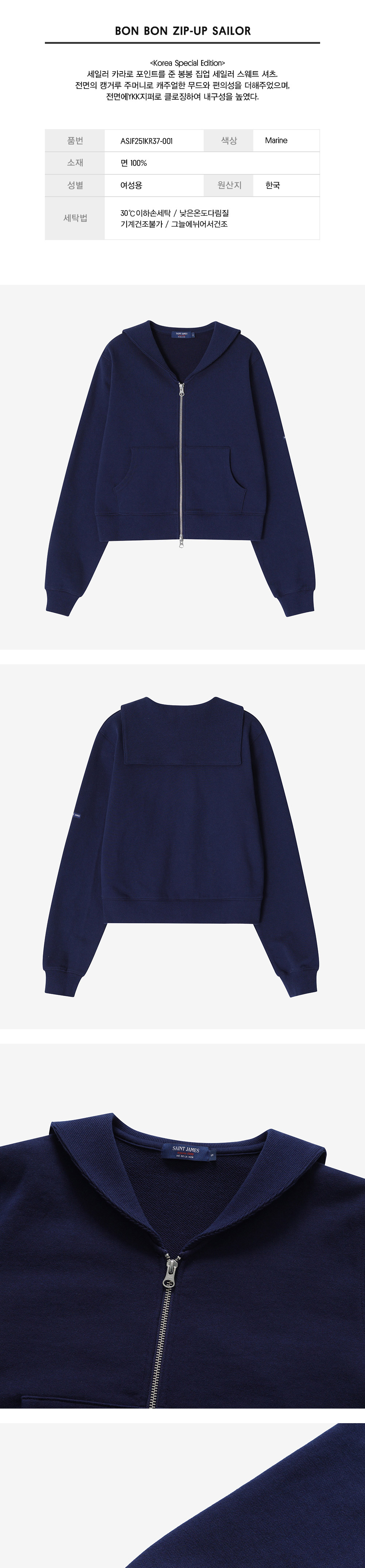 세일러 카라로 포인트를 준 봉봉 집업 세일러 스웻 셔츠. 전면의 캥거루 주머니로 캐주얼한 무드와 편의성을 더해주었으며, 전면에YKK지퍼로 클로징하여 내구성을 높였다."
