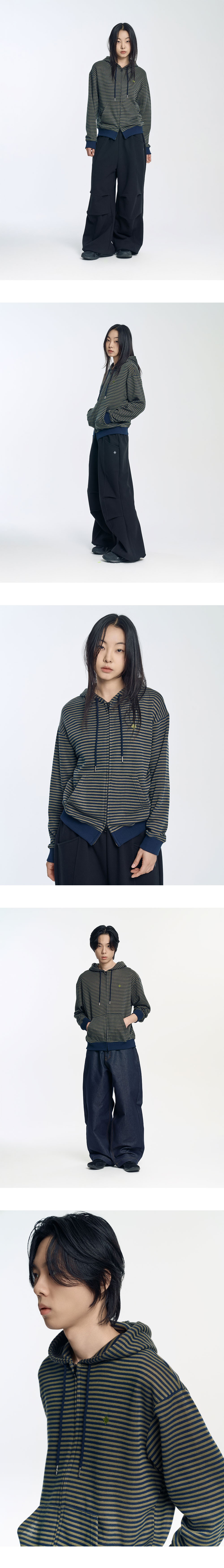 SLOW RECORD HOUSE Stripe Knit Hood Zip-Up Khaki