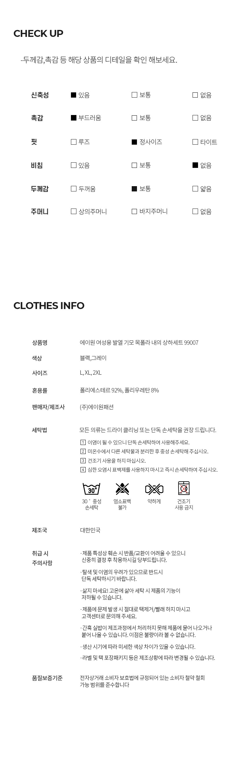 [3% 적립] (W) 에이원 발열 기모 목폴라 내의 상하세트 블랙