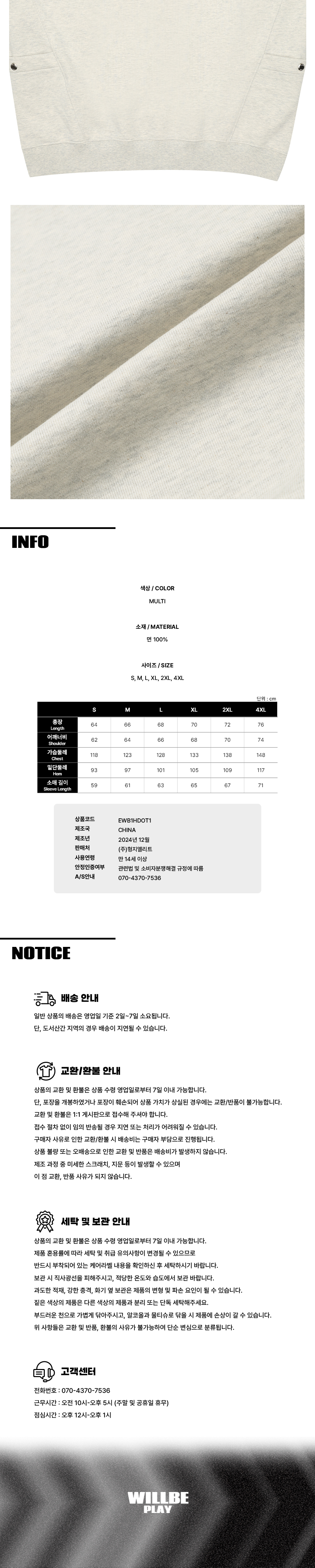 | 가슴둘레 | 어깨너비 | 밑단 둘레 | 소매 길이 | 총장 |
