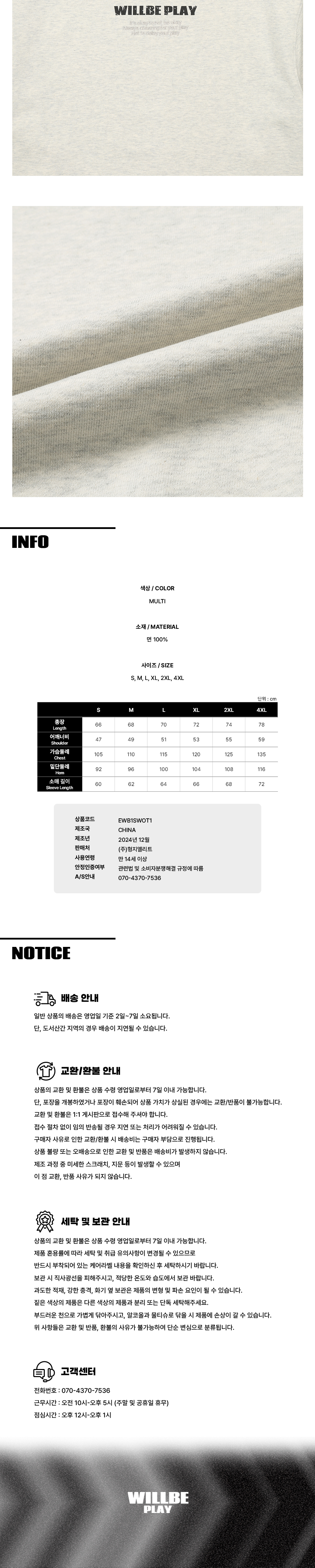 | 가슴둘레 | 어깨너비 | 밑단 둘레 | 소매 길이 | 총장 |