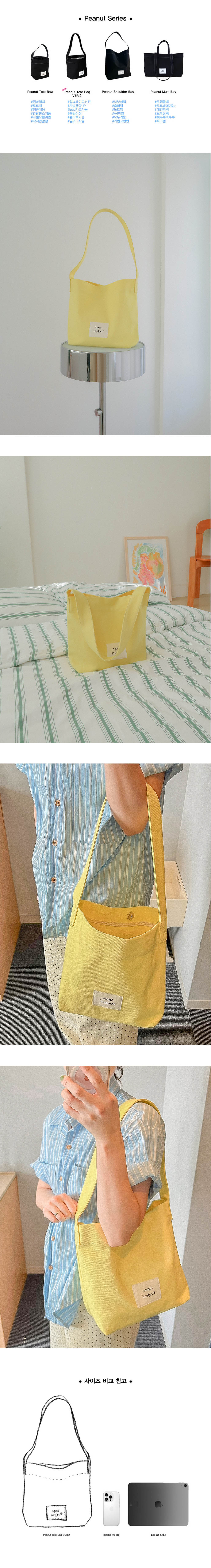 아그네스프로젝트의 스테디셀러 백 Peanut Tote Bag의 SIZE UP Ver. 2020년도 첫 출시 이후 많은 사랑을 받았고, 그동안 많은 고객님들의 요청이 있었는데요. 고객님들의 니즈를 반영하여 탄탄함은 그대로! 사이즈는 좀 더 키우고, 핸들은 기존 토트에서 숄더까지 더 여유롭게 사이즈가 업그레이드 되었습니다. 기존 Peanut Tote Bag보다 여유로운 사이즈와 여유로운 숄더로 사용하실 수 있으며, 컬러는 Peanut Tote Bag의 베스트컬러인 블랙, 레드, 내추럴, 레몬 4컬러에 아이스블루 1컬러가 새로 추가되었습니다. [Size] (W)23cm X (H)24 X (D)10cm 핸들길이 68cm 193g 'Peanut Series' 는 4가지 사이즈로 구성되어 있으니 사이즈 별 다양하게 활용해 보세요.