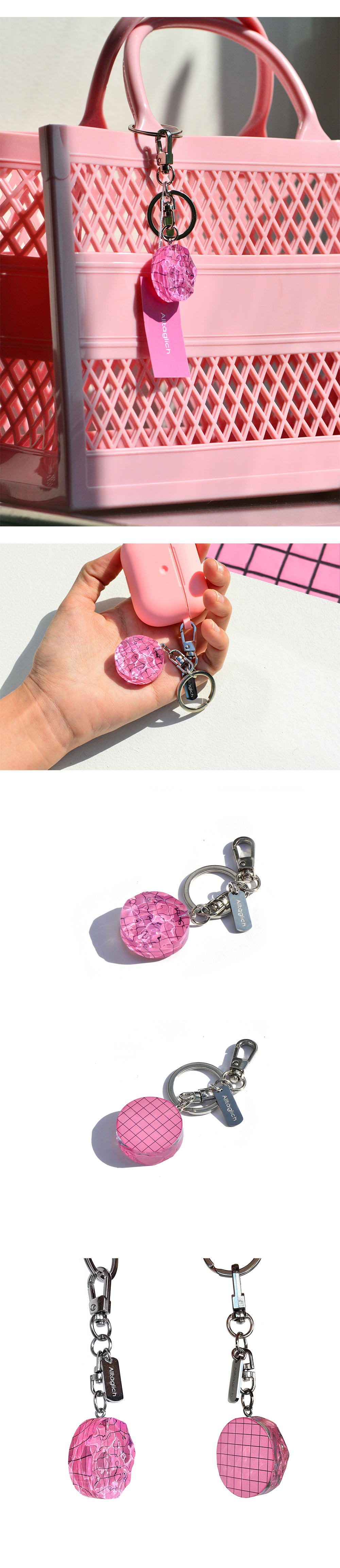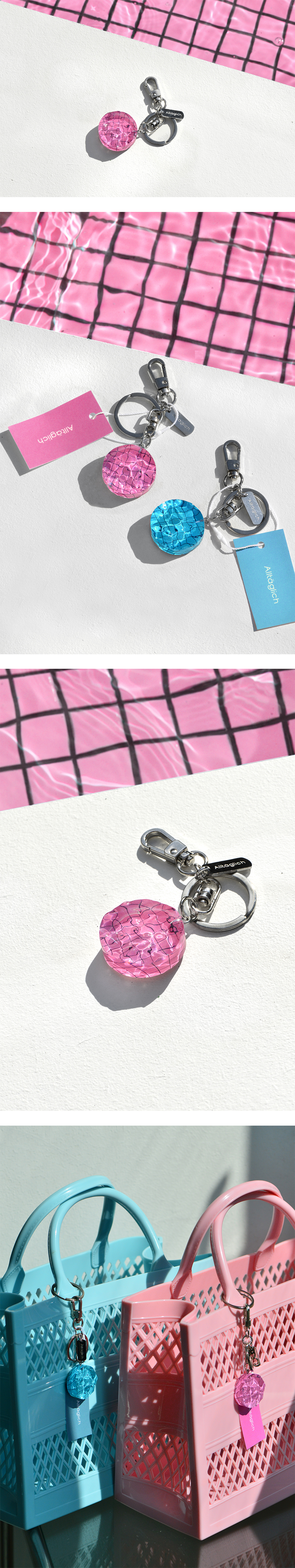 여름철 휴가지의 수영장 물결에서 영감을 받아 제작되었습니다. 수영하고 싶은 마음을 자극하는 핑크 수영장 키링! 수영과 일상을 이어주는 내 손안에 작은 수영장으로 청량한 하루를 시작하세요.