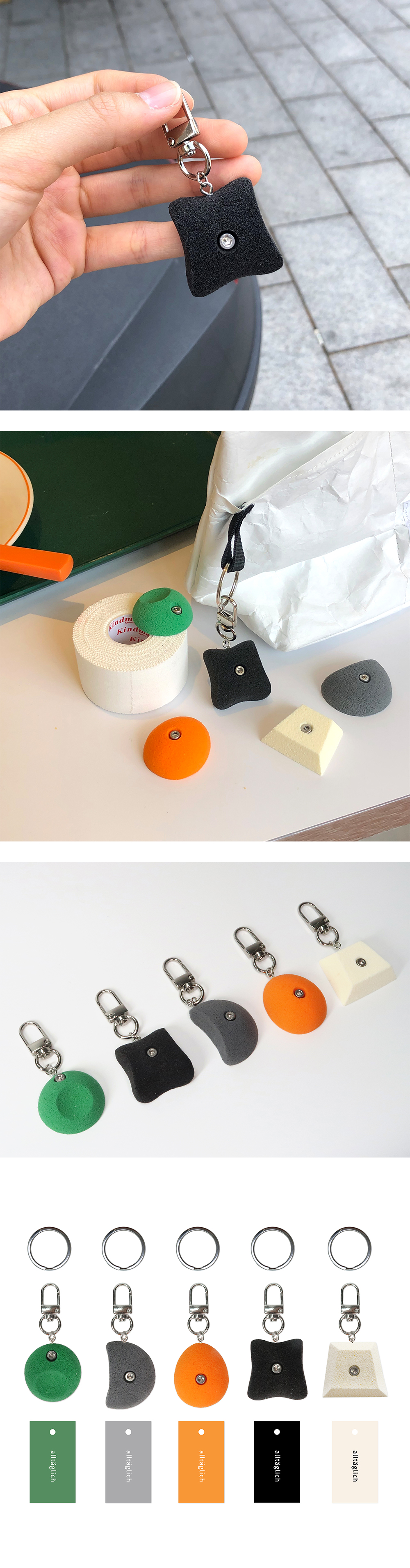알테그리히가 선보이는 제품인 ‘클라이밍 홀드 키링’은 클라이밍 홀드를 작은 사이즈로 제작하여 일상 속에서 귀엽게 들고다닐 수 있도록 출시되었습니다. 알테그리히의 홀드 키링은 실제 홀드와 동일한 소재로 같은 공정을 통하여 일상 속에서도 홀드 촉감을 직접적으로 느낄 수 있게 만들었습니다.