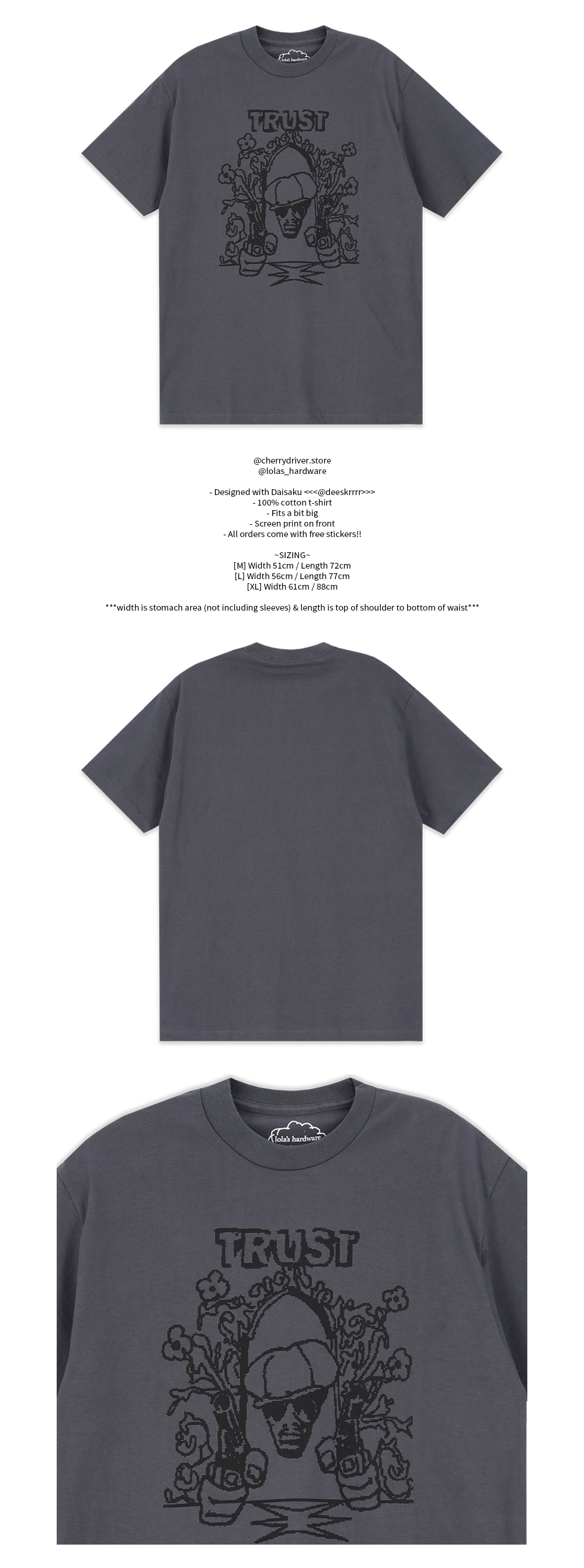@cherrydriver.store @lolas_hardware - Designed with Daisaku <<<@deeskrrrr>>> - 100% cotton t-shirt - Fits a bit big - Screen print on front - All orders come with free stickers!! ~SIZING~ [M] Width 51cm / Length 72cm [L] Width 56cm / Length 77cm [XL] Width 61cm / 88cm ***width is stomach area (not including sleeves) & length is top of shoulder to bottom of waist***
