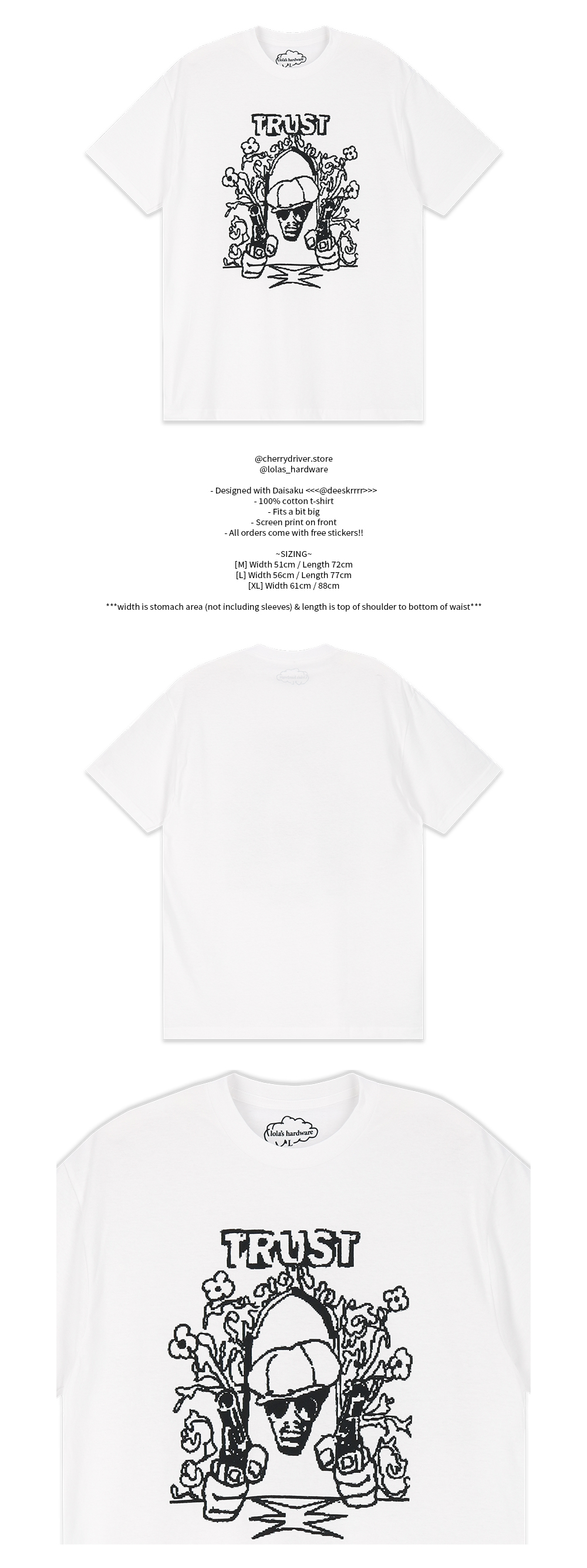 @cherrydriver.store @lolas_hardware - Designed with Daisaku <<<@deeskrrrr>>> - 100% cotton t-shirt - Fits a bit big - Screen print on front - All orders come with free stickers!! ~SIZING~ [M] Width 51cm / Length 72cm [L] Width 56cm / Length 77cm [XL] Width 61cm / 88cm ***width is stomach area (not including sleeves) & length is top of shoulder to bottom of waist***