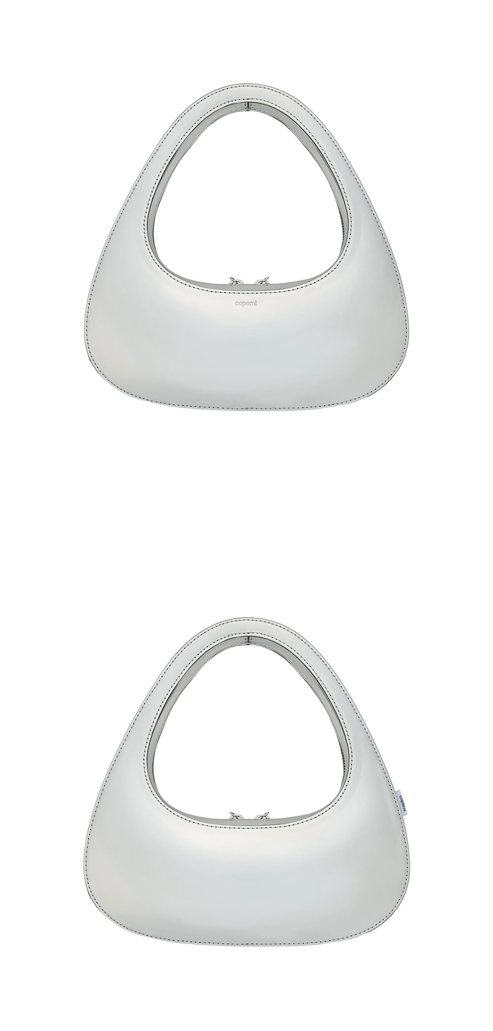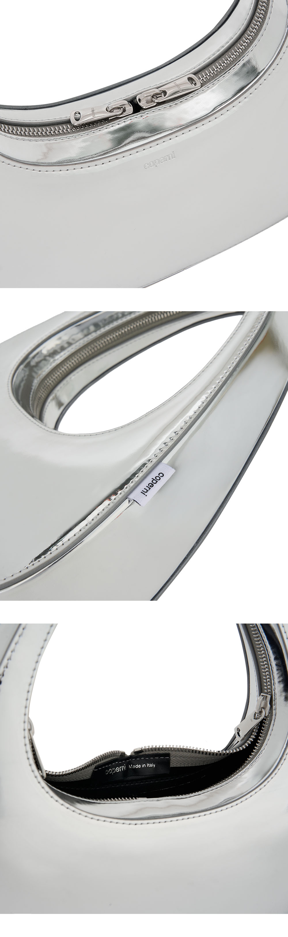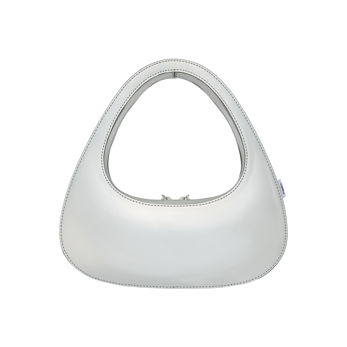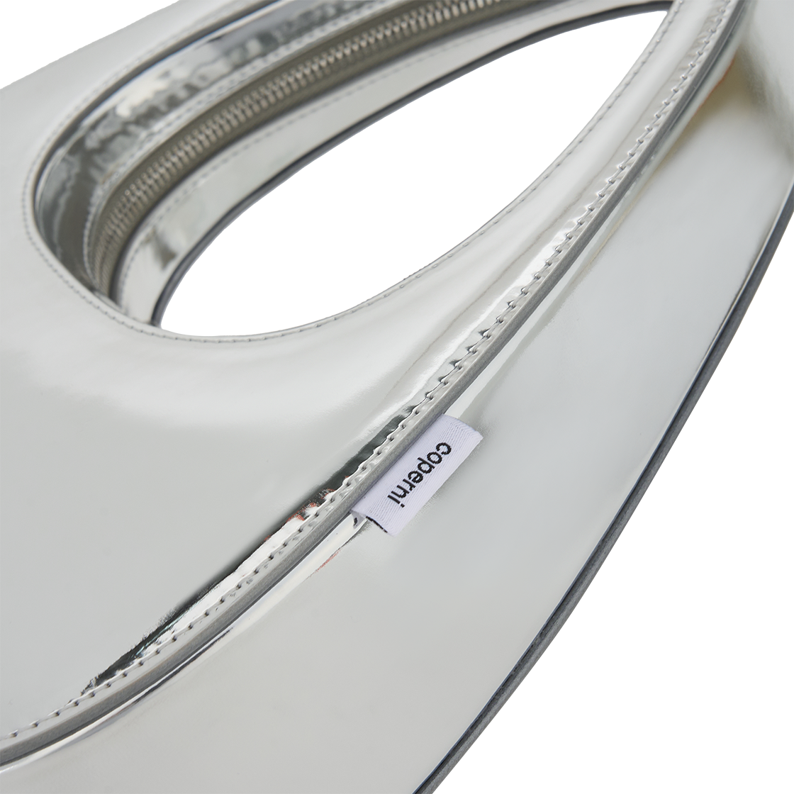 메탈릭한 느낌으로 포인트를 주는 코페르니의 미러드 바게트 스와이프 백입니다. - 모양이 흐트러지지 않는 바게트백 - 안쪽과 바깥쪽의 메탈 실버 디테일