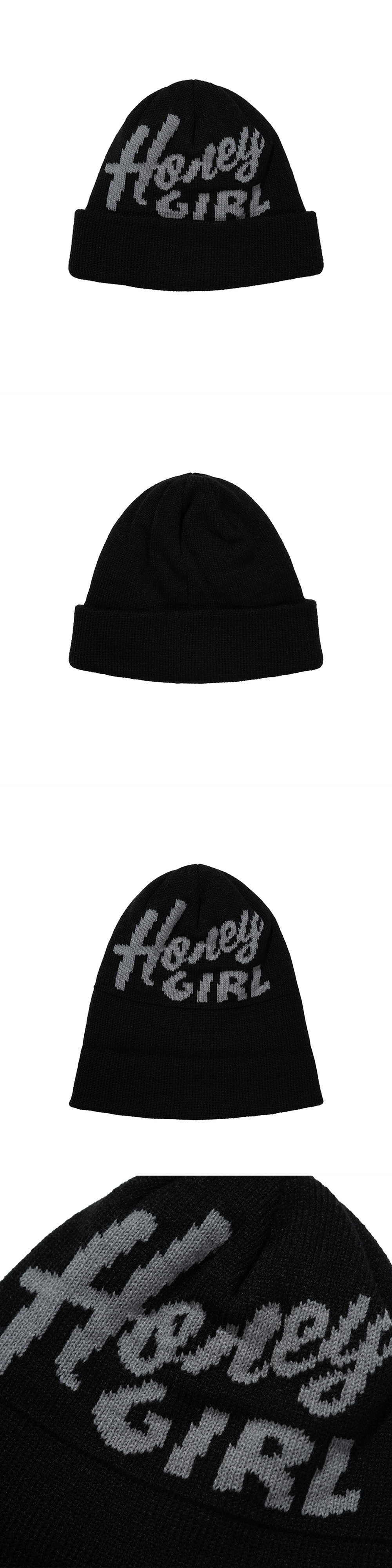 HONEY SCOOP HOUSE HONEY GIRL CUFF BEANIE BLACK 100% ACRYLIC WIDE CUFF FEATURING A JACQUARD KNIT HONEY GIRL LOGO SIZE CHART ONE SIZE FITS ALL