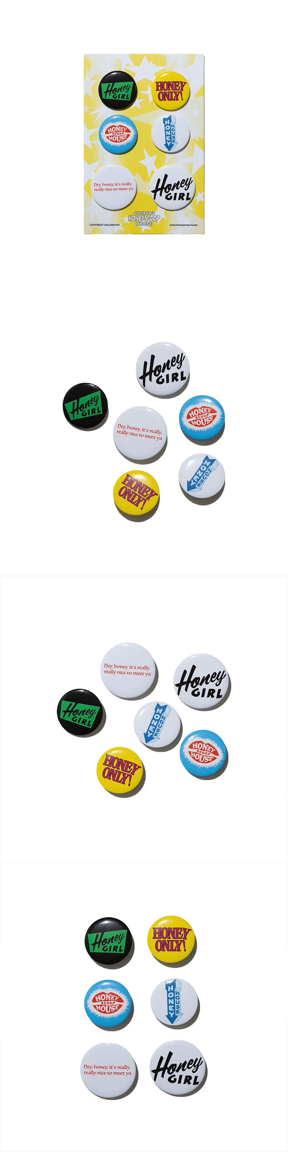 HONEY SCOOP HOUSE BUTTON BADGE SET MULTI 100% STAINLESS STEEL 2 SIZE * 32mm / 38mm SET OF 6 STAINLESS STEEL PINS MULTI DESIGN PINS CLOSURE AT BACK