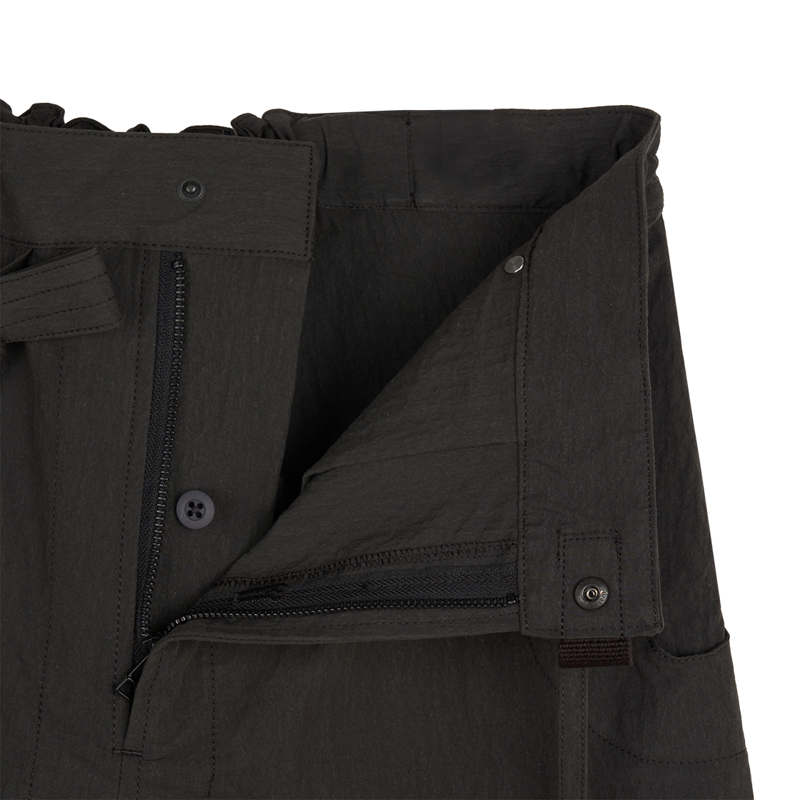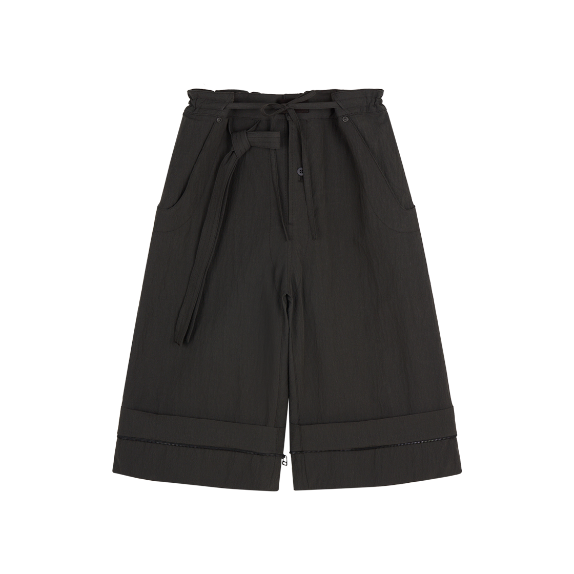 해체주의의 미학을 보여 주는 지안 예의 알리 백 팬츠입니다. - 지퍼를 통해 반바지로 분리 가능 - 허리는 끈으로 사이즈 조절 - 밑단 스트링