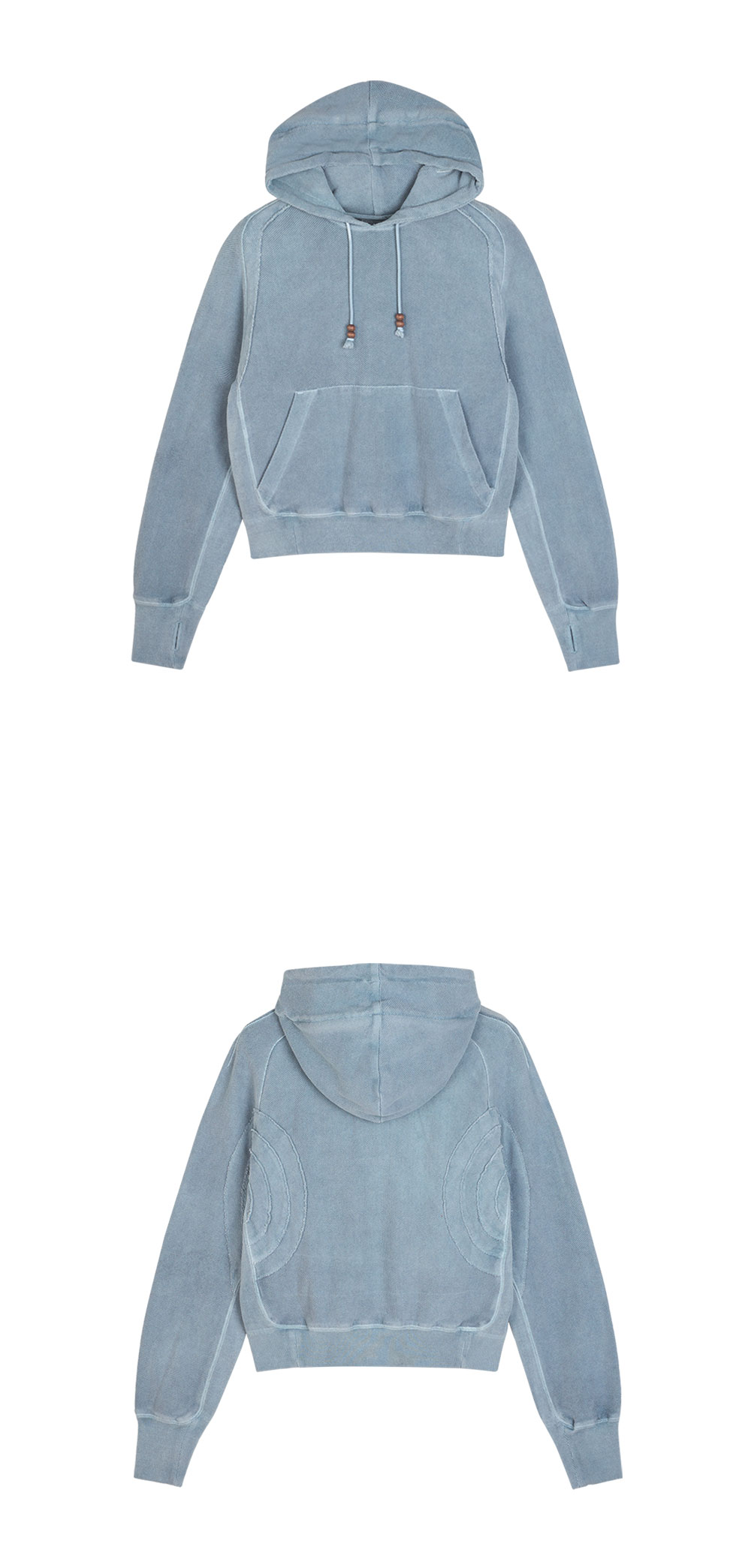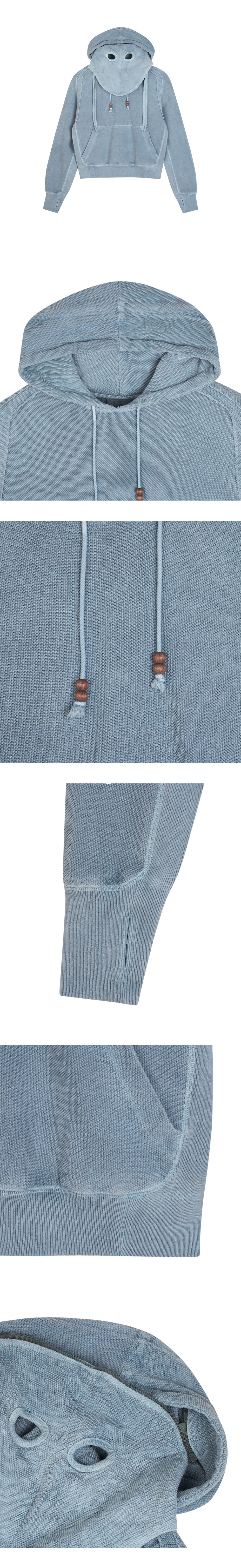 마스크 디테일이 색다른 무드를 연출하는 지안 예의 오빗 마스크 후드입니다. - 염색의 물든 느낌의 아쿠아 색상 - 뒷면에 패치워크 디테일 - 소매에 핑거 홀