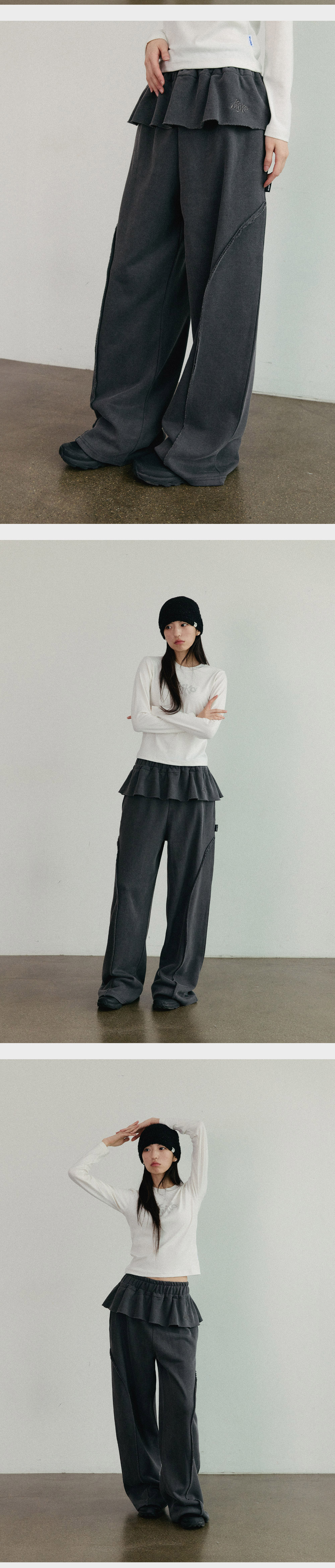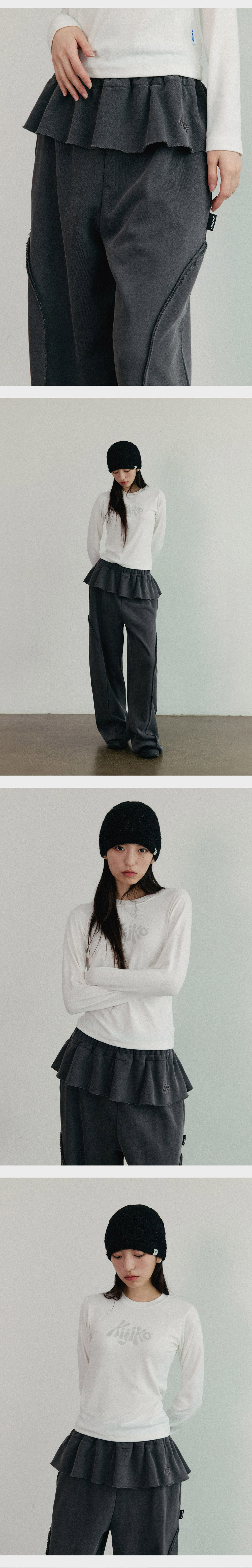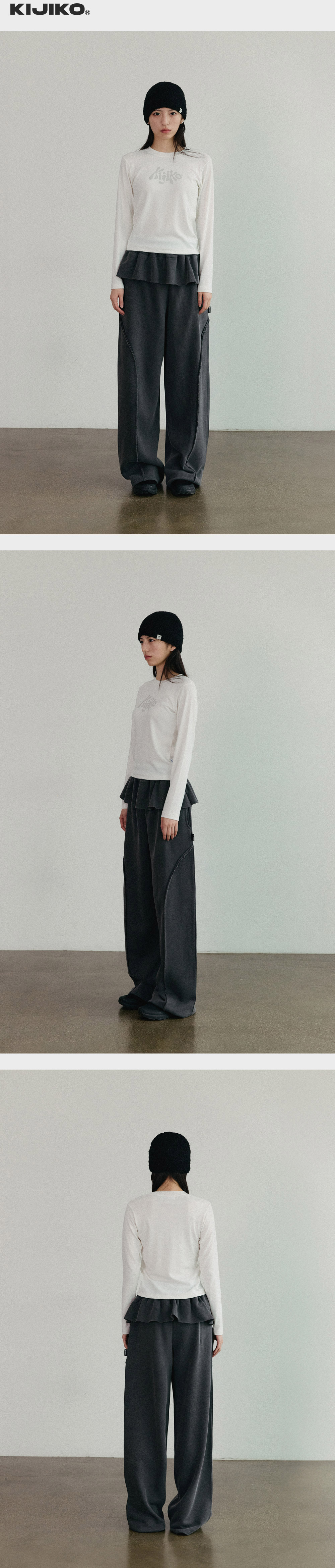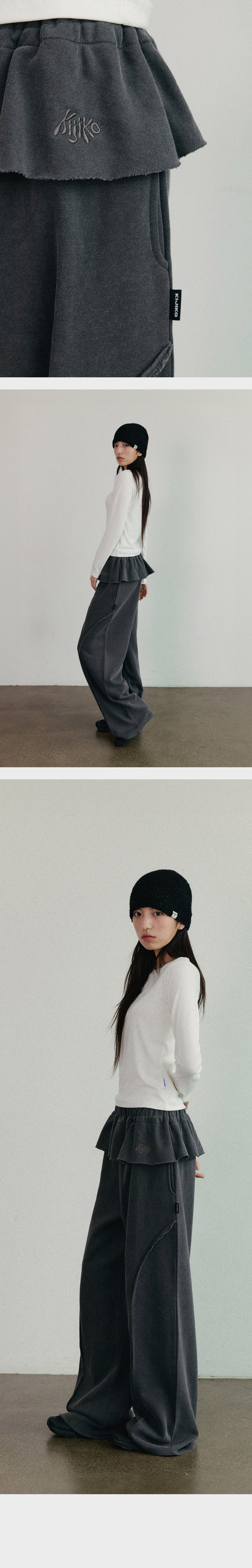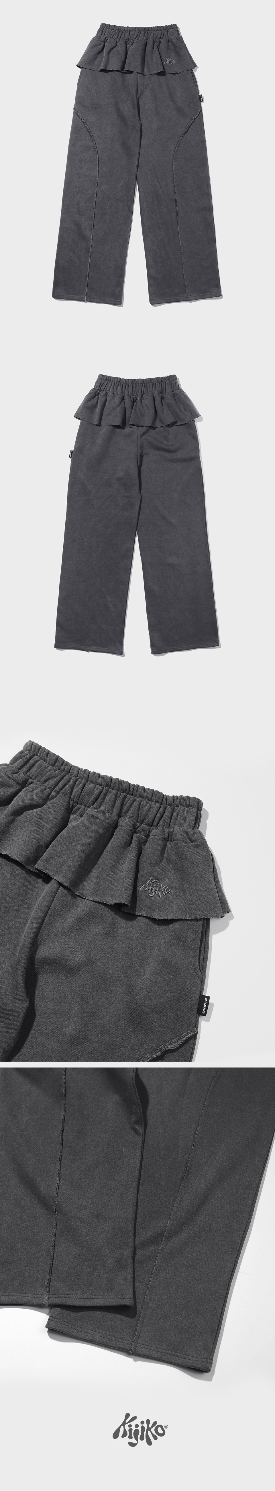 KIJIKO® PRODUCT DESCRIPTION 유니크한 디자인의 피그먼트 프릴 팬츠 - 고중량의 피그먼트 워싱 원단 사용 - 고탄력의 2인치 밴드를 사용하여 안정된 착용감 - 프릴과 라인 포인트 마감을 데끼로 표현 - 기장을 길게 패턴하여 빈티지하게 착용가능 • DESCRIPTION - Outer Fabric - Cotton 100% - Pigment Fabric - Embroidery Work - Side Label • SIZE INFORMATION - Model Size - Height 170 / Wearing OS Size - One size - 총장/108 - 허리/30 - 엉덩이/52 - 밑위/33 - 허벅지/37 - 밑단/30