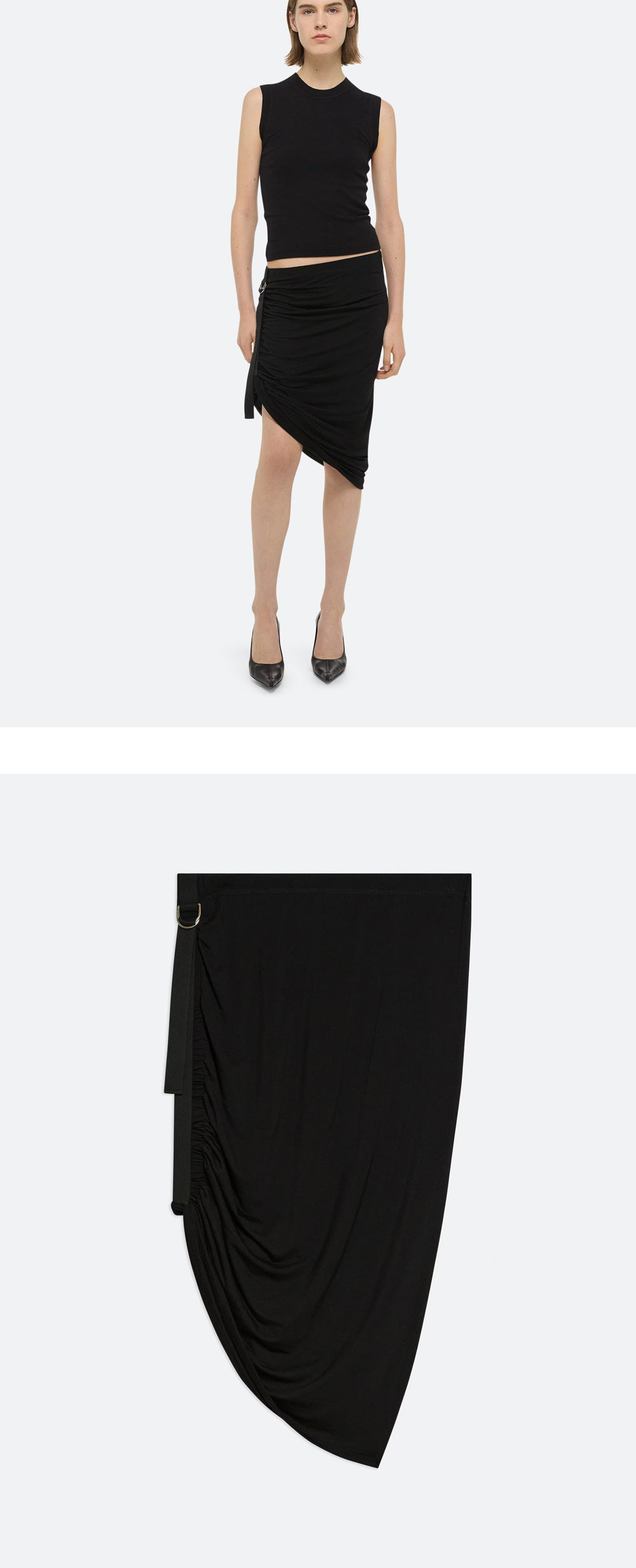 시그니처 안전벨트 스트랩으로 스커트의 길이를 조절할 수 있는 헬무트 랭의 우먼 윈드 미니 스커트 블랙입니다. - 언발란스 스커트 - D-링 앵커 - 포인트 아이템 - 루싱 디테일