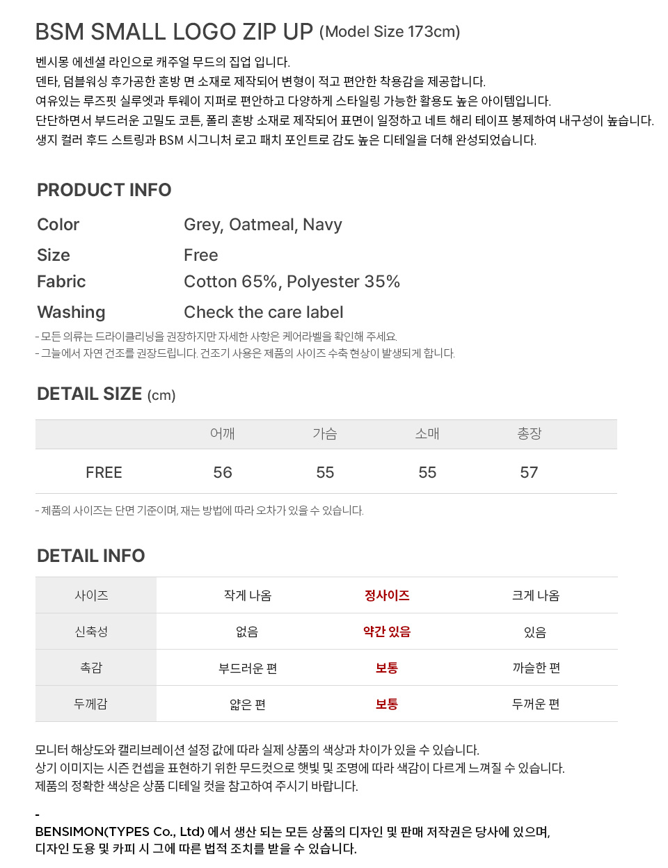 벤시몽 비에스엠 스몰 로고 집업 오트밀