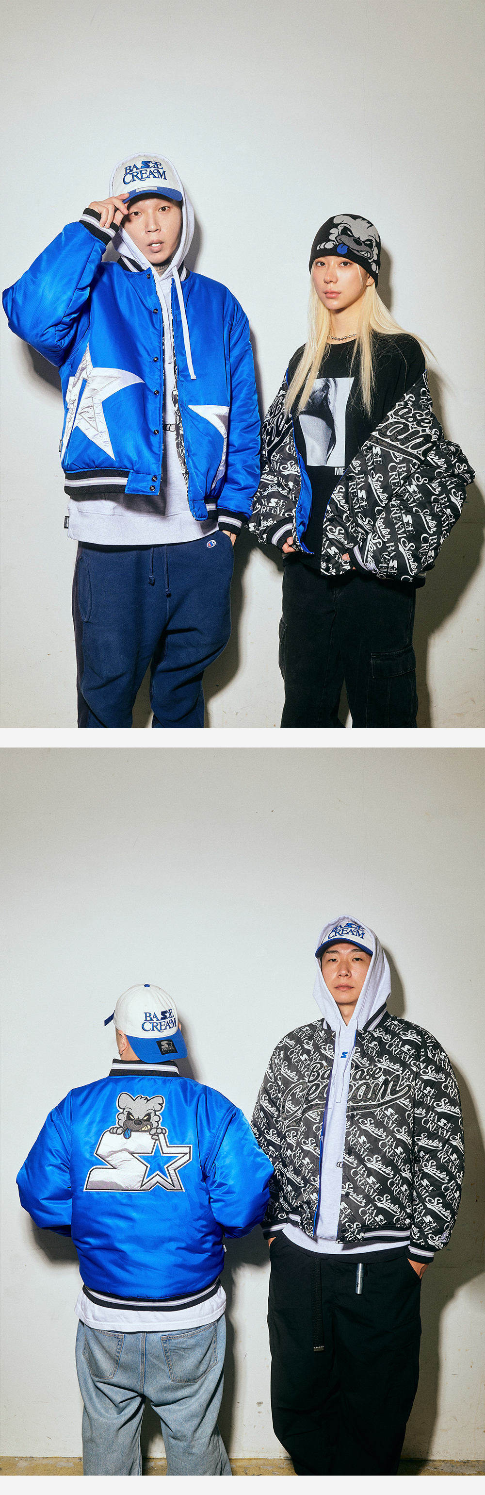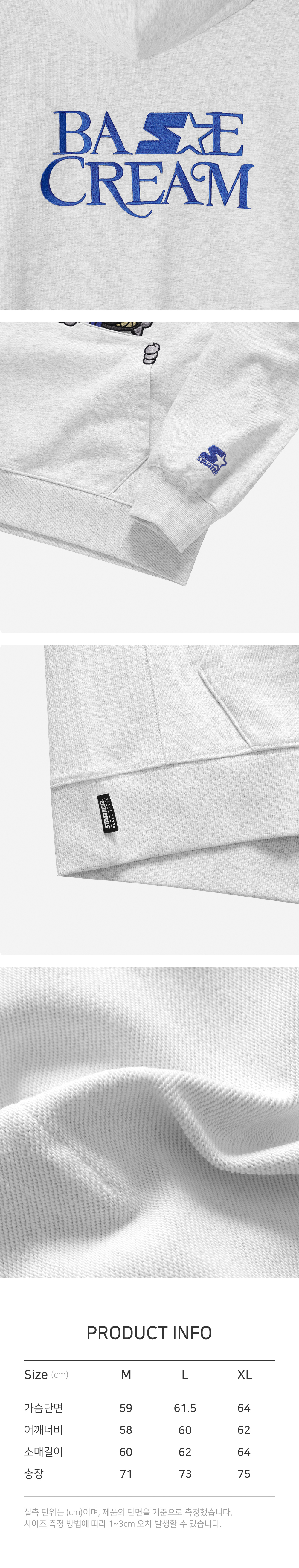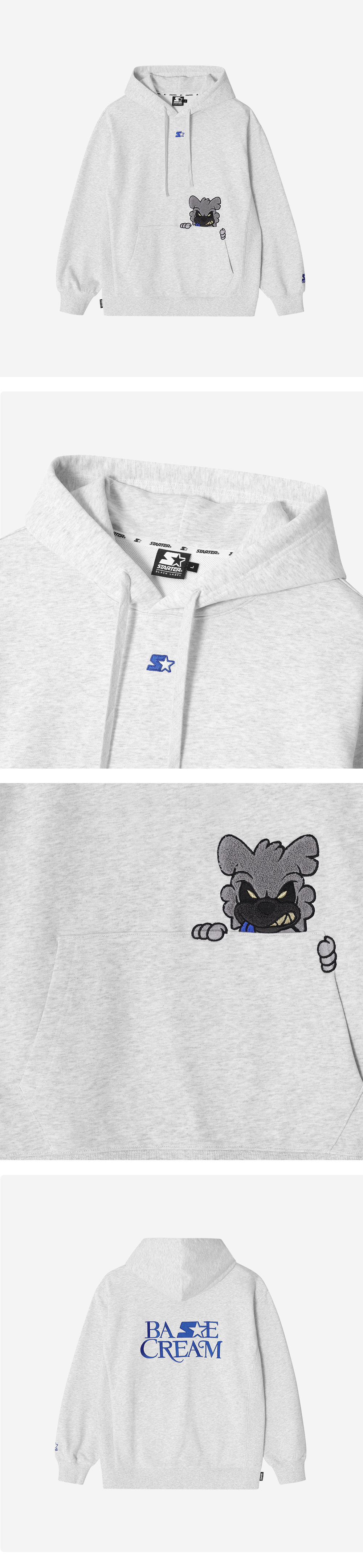 스타터와 베이스크림의 콜라보 스웻 후디입니다. 420G의 헤비 스웻 원단으로 제작되어 내구성이 좋으며, 옆면부에 RIB 디테일이 들어가 착용시 한층 더 편안한 핏을 제공합니다. 전면부 포켓을 잡고있는 쿠카 캐릭터가 부클 자수로 입체감있게 표현되었고 후면부 스타터 베이스크림 로고가 블루 컬러로 제작되어 포인트를 더해줍니다.