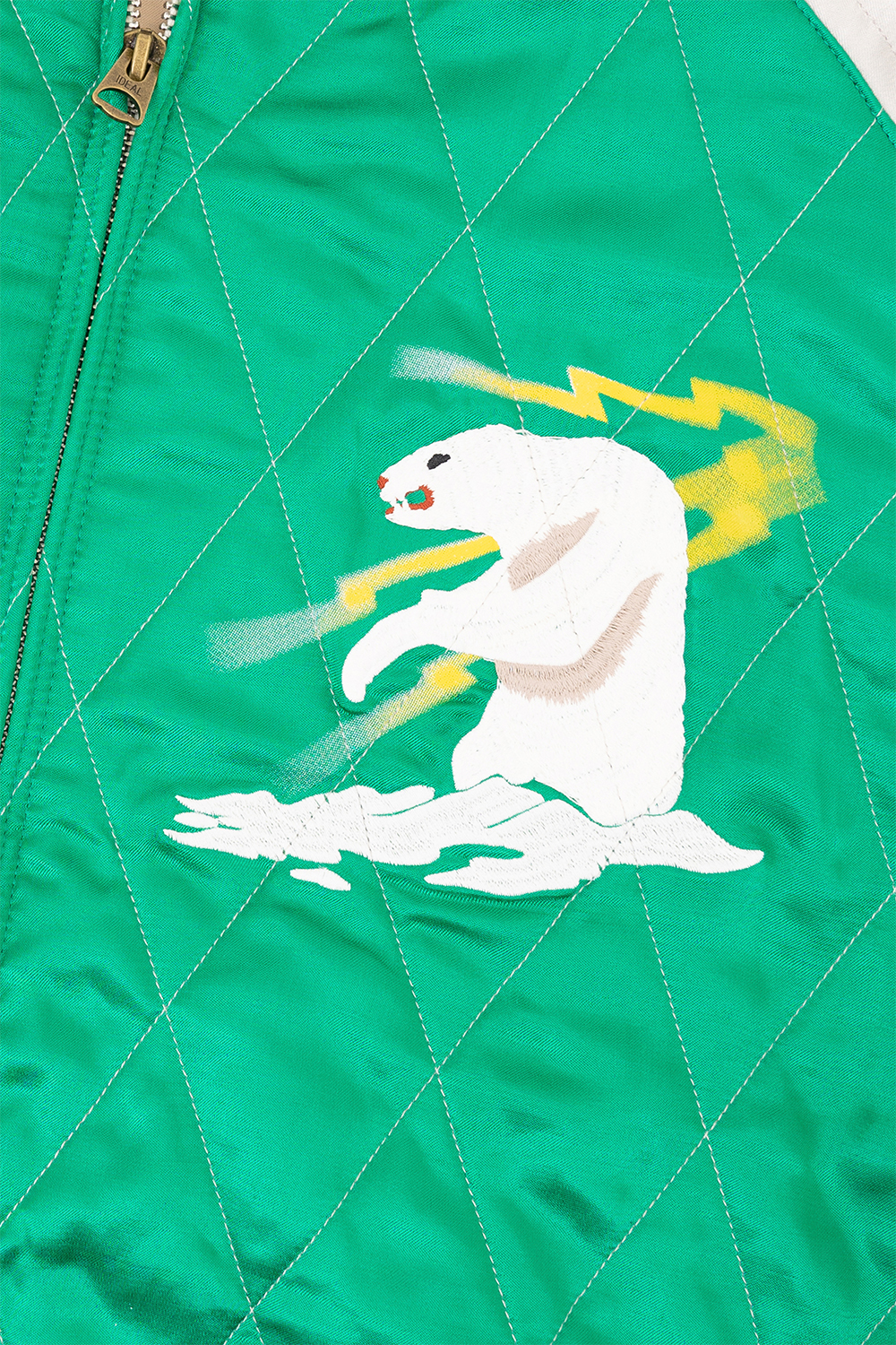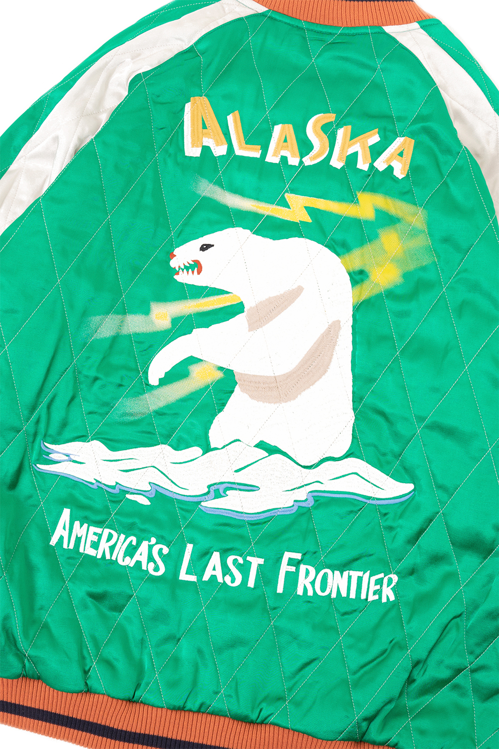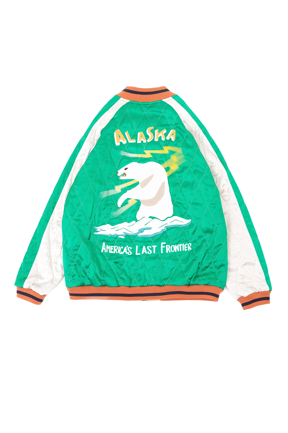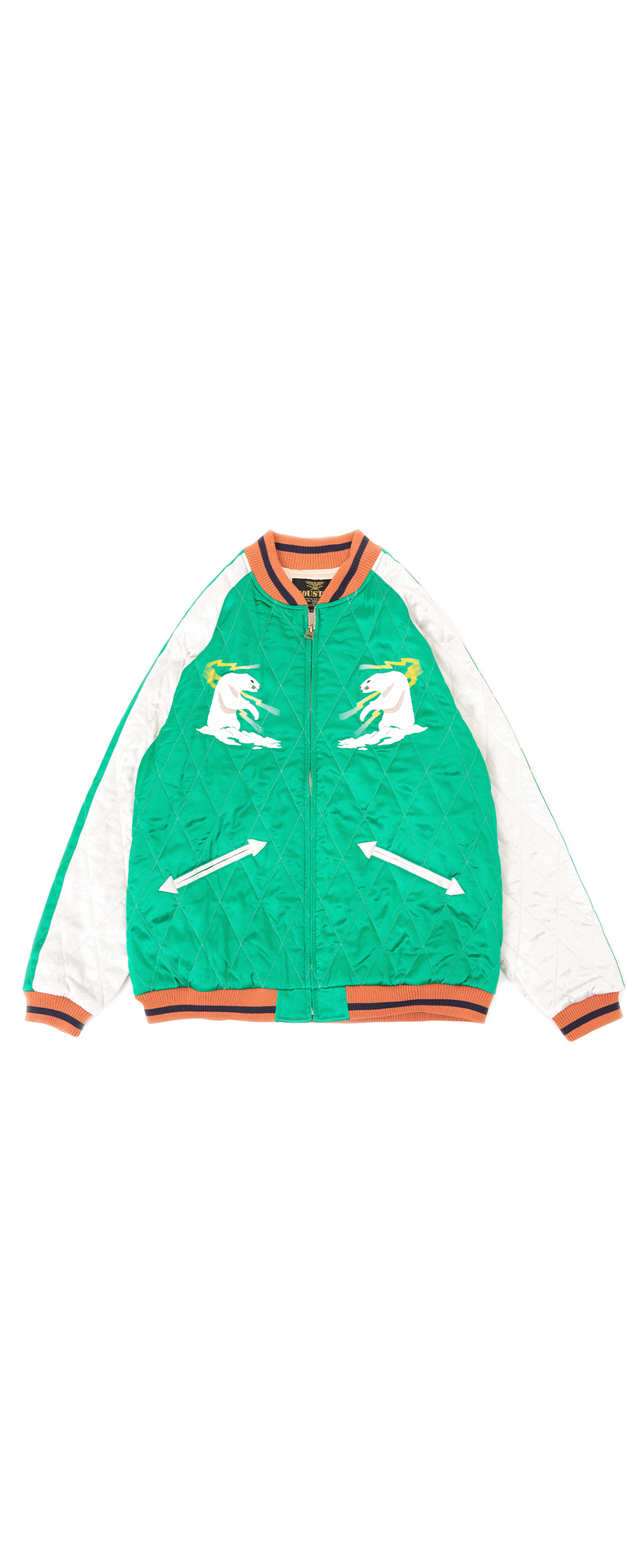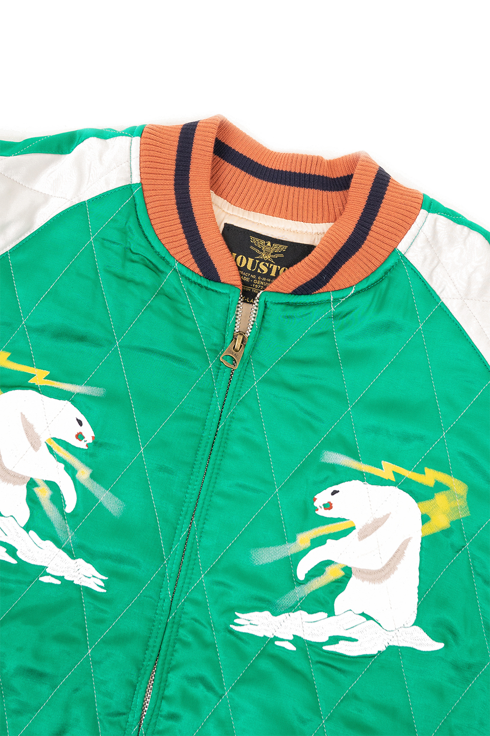 Houston Japan 51468 Rayon Souvenir Jacket (Alaska) - Green 퀼팅 스티치가 들어간 수베니어 자켓입니다. 알래스카 무늬가 특징입니다. * Upper : Rayon 100% * Lining : Rayon 100% * Lib: Acrylic 100% * Filling : Polyester 100% * 빛에 의한 제품의 색감 차이가 존재 할 수 있습니다. * Made in China