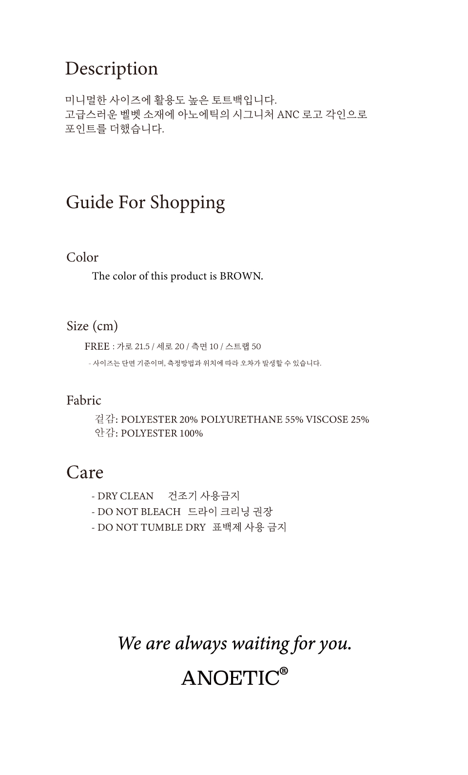 제품 원단 특성상 밝은 컬러의 의류 및 잡화는 가급적 피해서 착용해 주시고 , 접촉 시 제품 표면이 오염 또는 이염될 수 있습니다. 또한 비,눈 등 수분과 접촉 시 변형,변색이 될 수 있으니 주의하십시오.