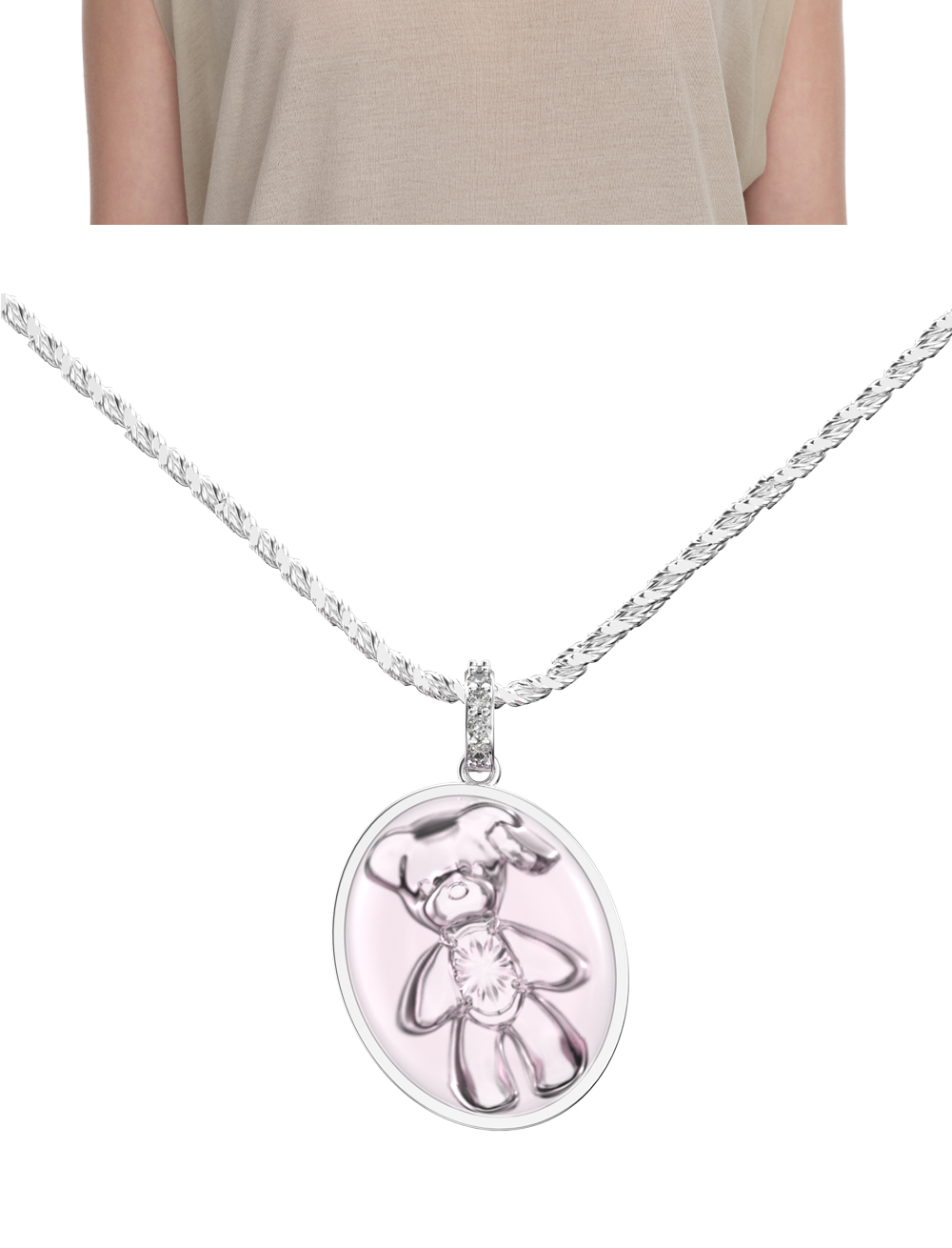 사랑스러운 무드를 뽐내는 위민의 크리스탈 베어 오벌 펜던트 네클리스입니다. - 반짝이는 오벌 핑크 크리스탈에 새겨진 베어 - 하트 모양의 팬던트 이음새