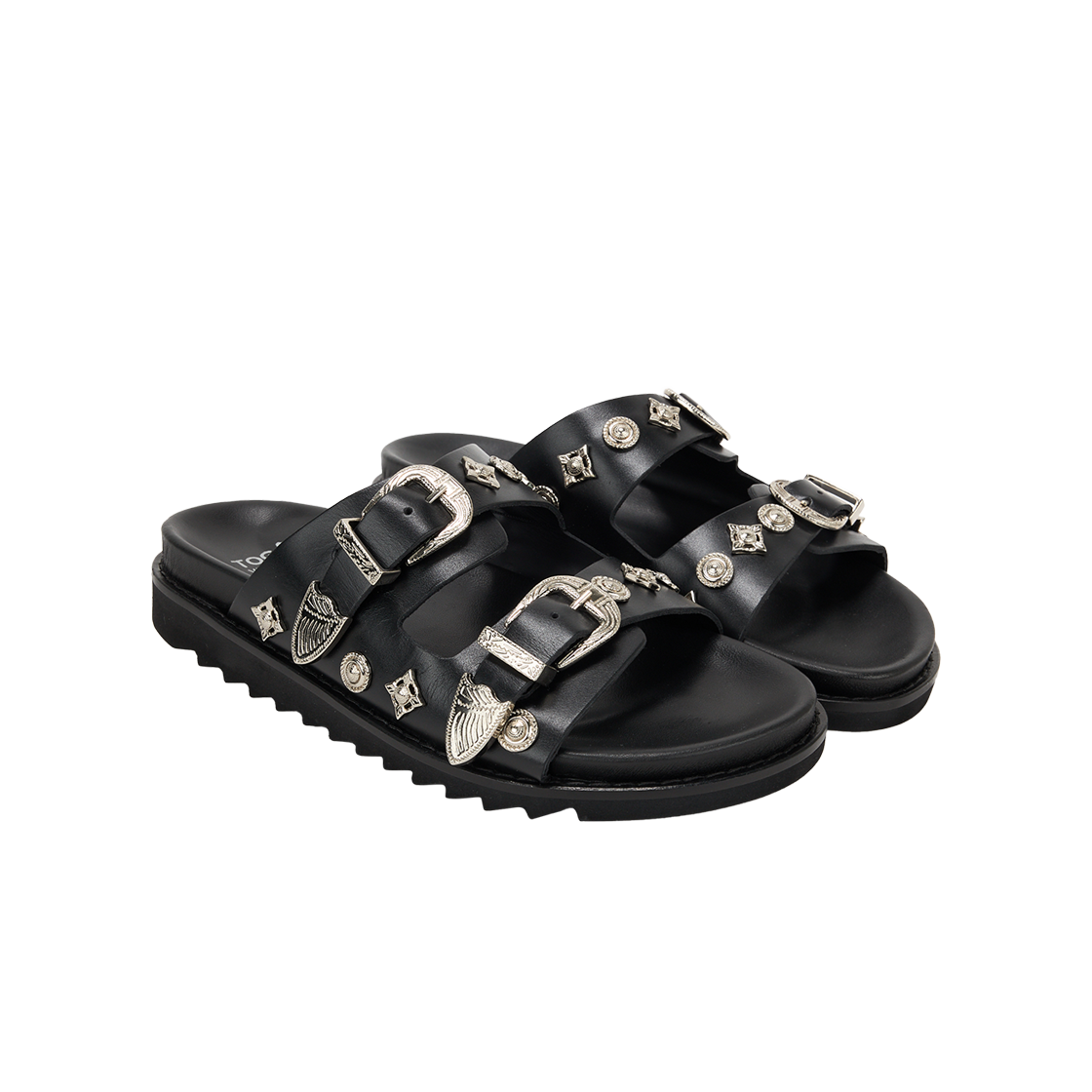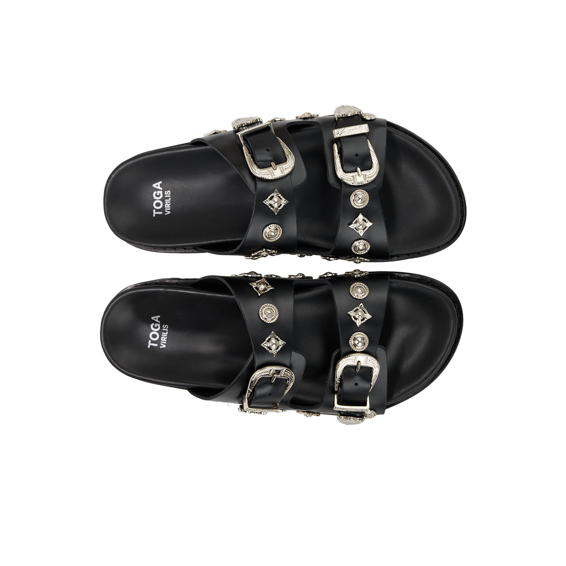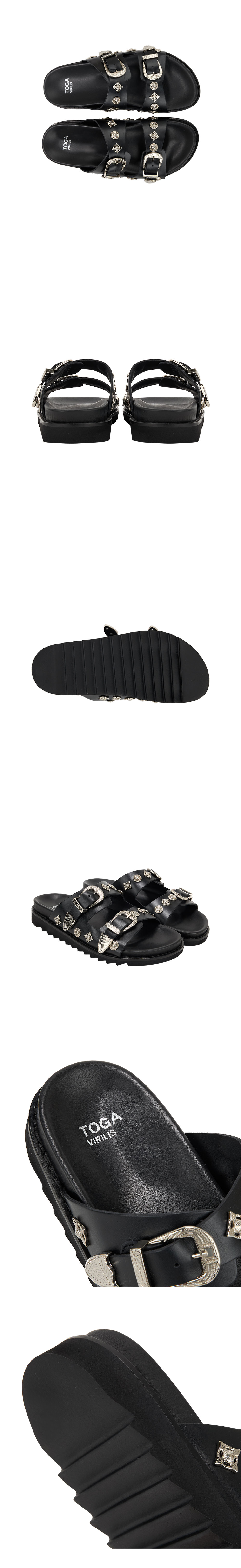 버클 금속 장식이 포인트인 토가의 비릴리스 AJ830 레더 블랙입니다. - 전체에 시그니처 그래픽 하드웨어 - 부드러운 깔창 - 사이즈 조정 가능한 버클