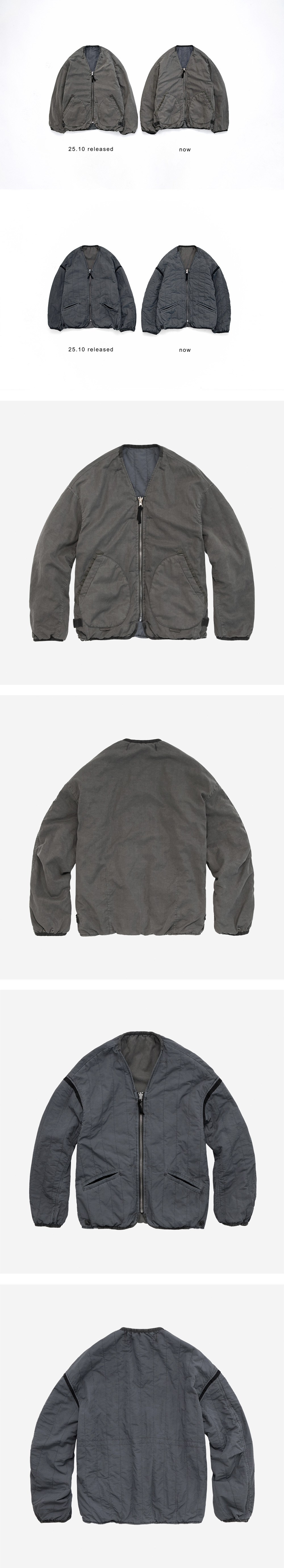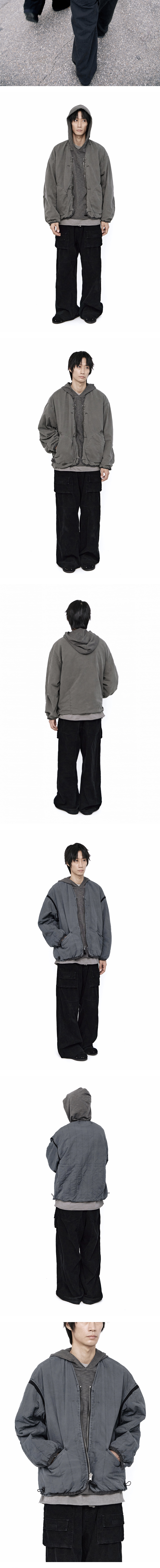 reversible liner jacket - sage gray + jade 전후면 리버시블 착용 가능한 제품, 전신이 되는 quilted cardigan을 다듬은 A면과 물방울 형태 패치포켓 적용된 고전적 라이너 형상의 B면으로 구성, 한층 더 부드러운 촉감과 몸에 감기는 착용감. 복합적인 다잉과 워싱 적용해 깊이감 있고 자연스러운 색감. - A면: 톤다운된 러프한 질감의 가먼트 다이드 세이지 그레이 컬러 - B면: 사각이는 입자감, 세로 퀼팅 및 자연스러운 사용감 느껴지는 제이드 컬러 군데군데 적용된 밀리터리 테이프 디테일, 조절 가능한 소맷단과 밑단. 양면 자유로이 활용 가능한 리버스 지퍼 사용 및 다양한 배색 콤비네이션 등의 특징이 있습니다. 충전재는 신슐레이트 입니다. *모델: 170 중반 / 마른 체형, 3사이즈 착용 *직전 차수 대비, 금번 차수는 A면 (세이지 면)의 물방울 포켓 입구 테이프 색을 제원단과 유사한 톤으로 완성했습니다.