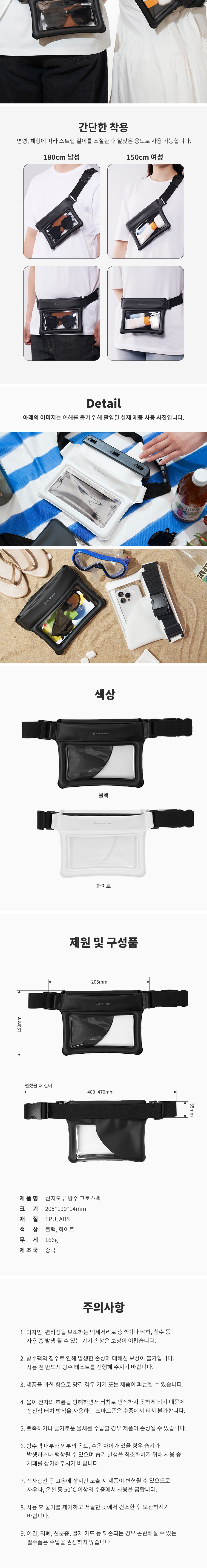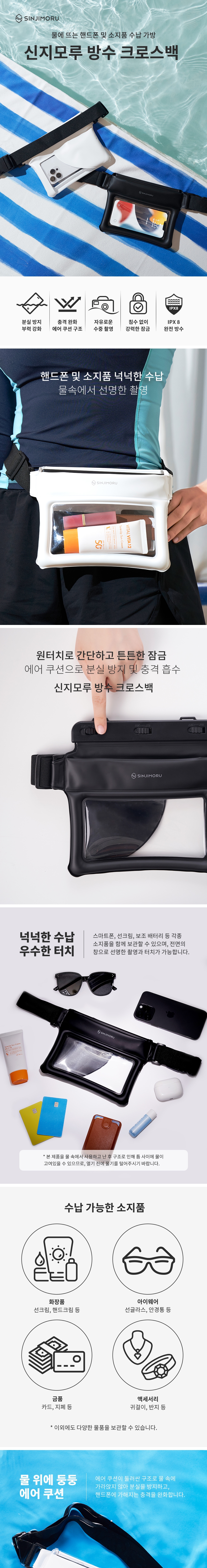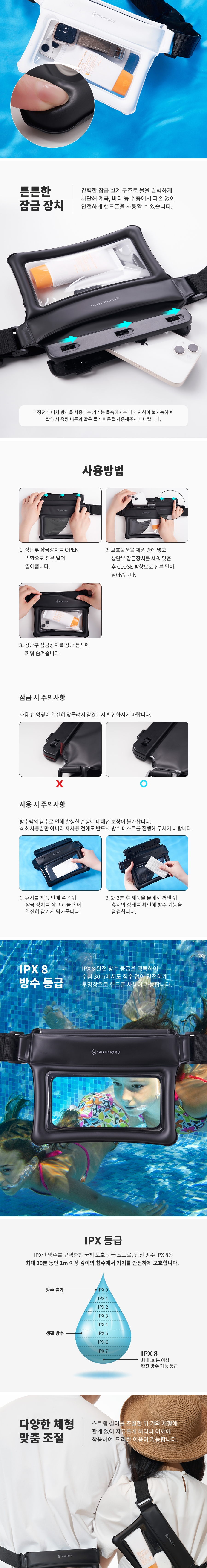 원터치 잠금 방수 가방! 스마트폰, 선크림, 선글라스, 보조배터리, 지갑 등 각종 소지품을 보관하는 넉넉한 수납 그리고 선명한 촬영 및 터치 가능
