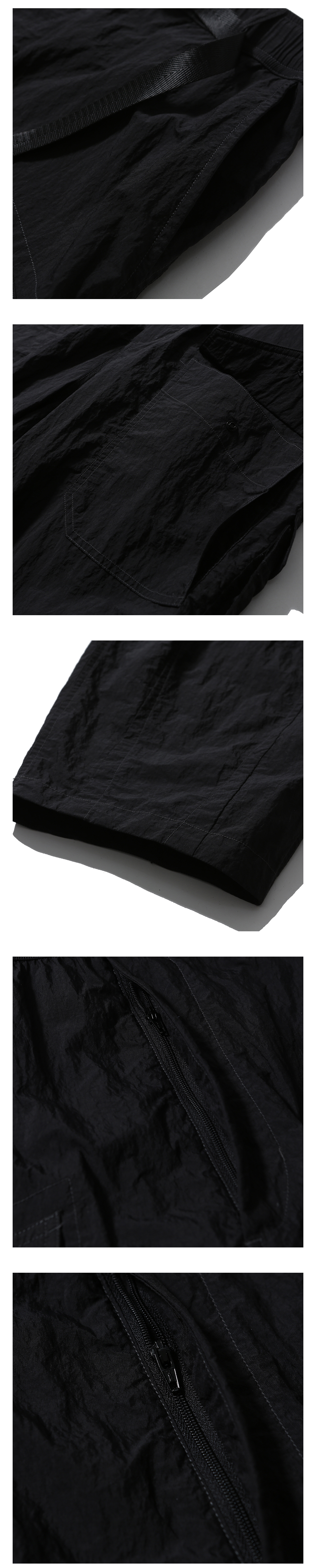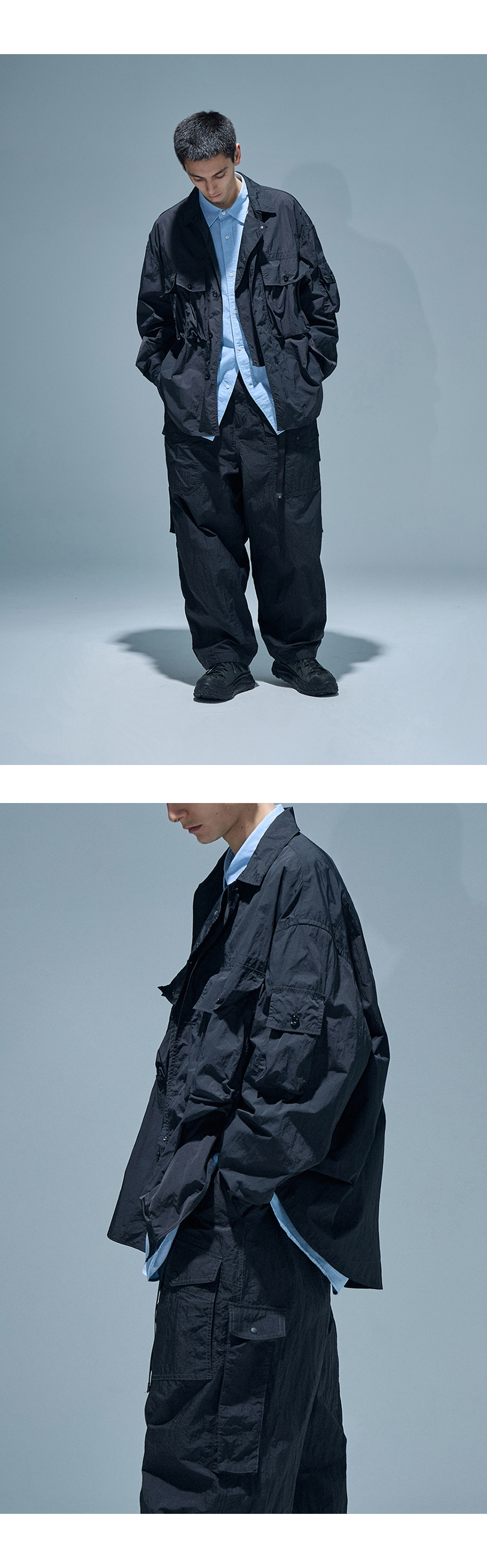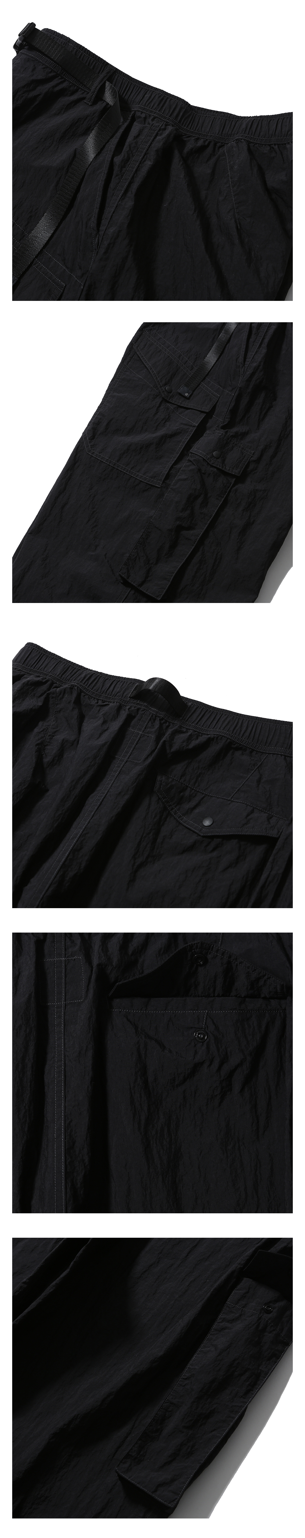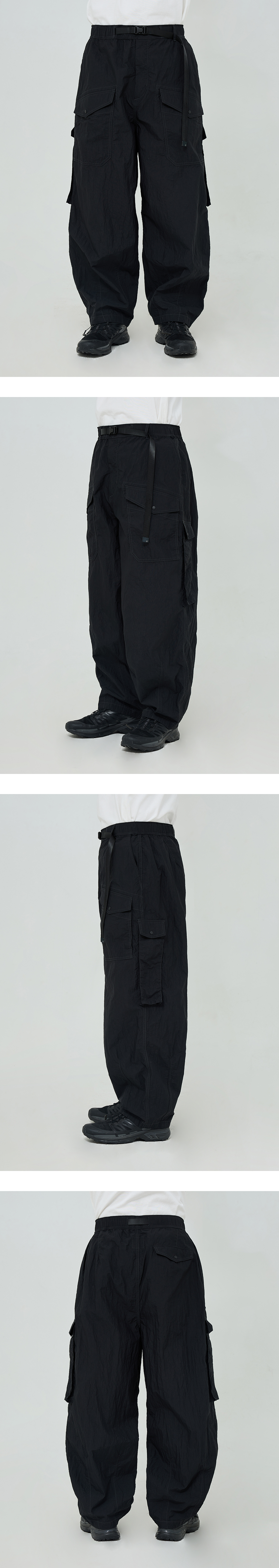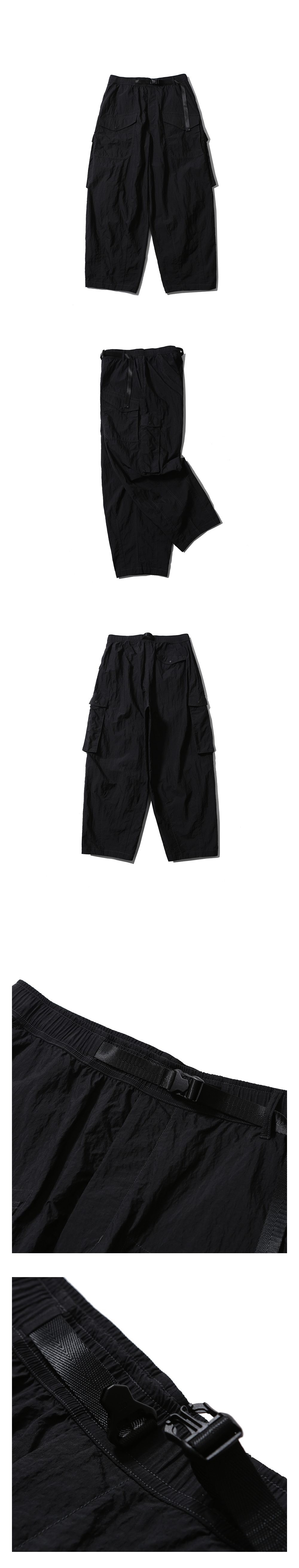 와이드 한 실루엣이 돋보이는 팬츠 · 와이드 한 오버사이즈 실루엣. · 메탈릭 한 표면감의 립스탑 크링클 나일론 원단 사용. · 허벅지와 사이드에 플랩이 달린 스냅 여밈의 패치 포켓 사양. · 신축성 있는 내장형 이밴드와 사이즈 조절이 가능한 허리 벨트 사양. · 밑단 쪽에 다트를 넣어 불륨감 있는 실루엣 연출.