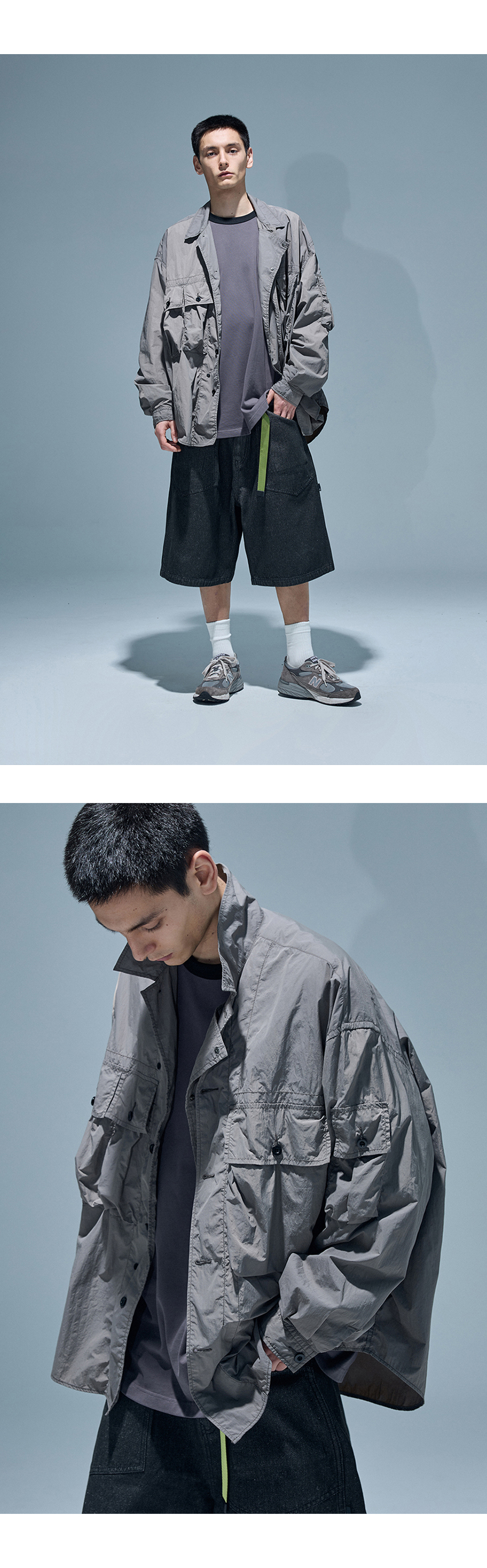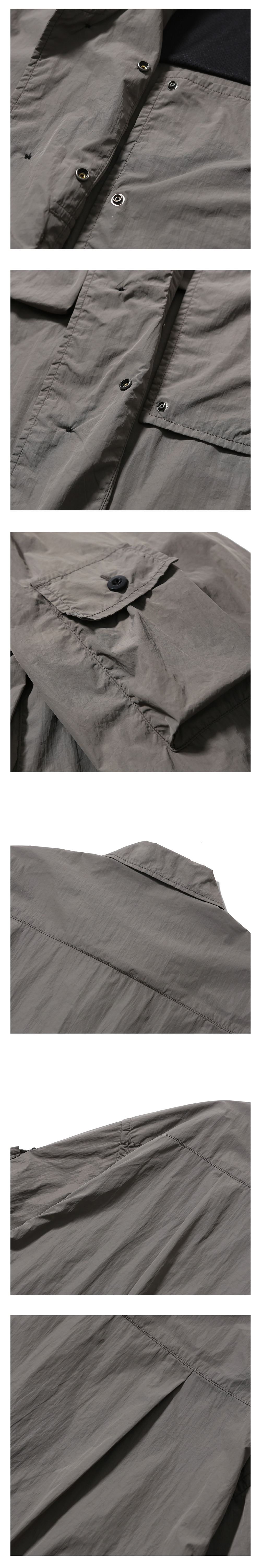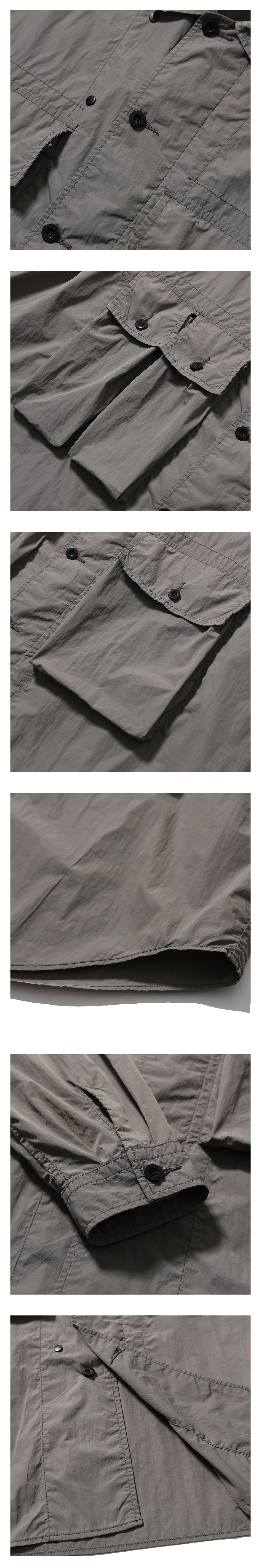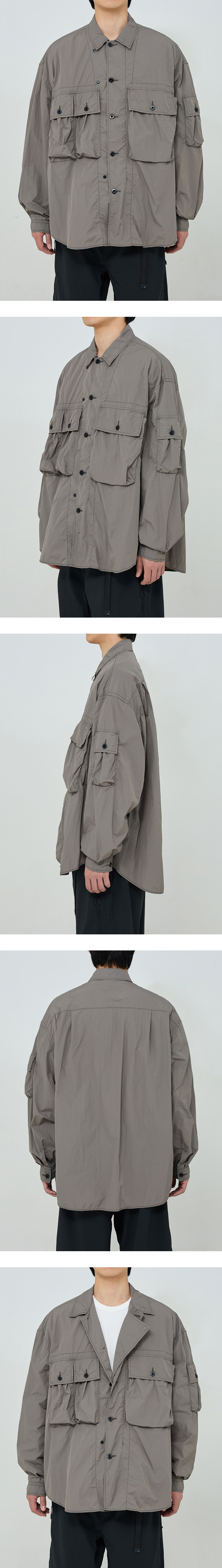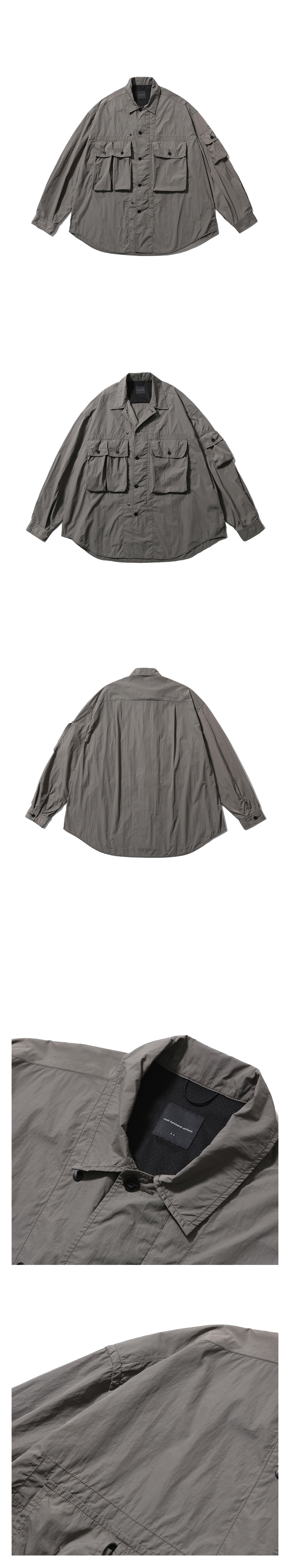 넉넉한 수납공간을 갖춘 활용도가 높은 오버 셔츠 · 와이드 한 오버사이즈 실루엣. · 얇고 부드러운 나일론 원단 사용. · 단추를 사용한 앞여밈 사양. · 모든 단추를 채워 입거나, 하나를 풀어 오픈 카라로 연출 가능. · 스냅으로 채울 수 있는 내부 앞가리개 사양. · 쾌적한 착용감을 위한 메쉬를 사용한 내부 요크. · 가슴과 소매에 4개로 구성된 다양한 사이즈의 멀티 포켓.