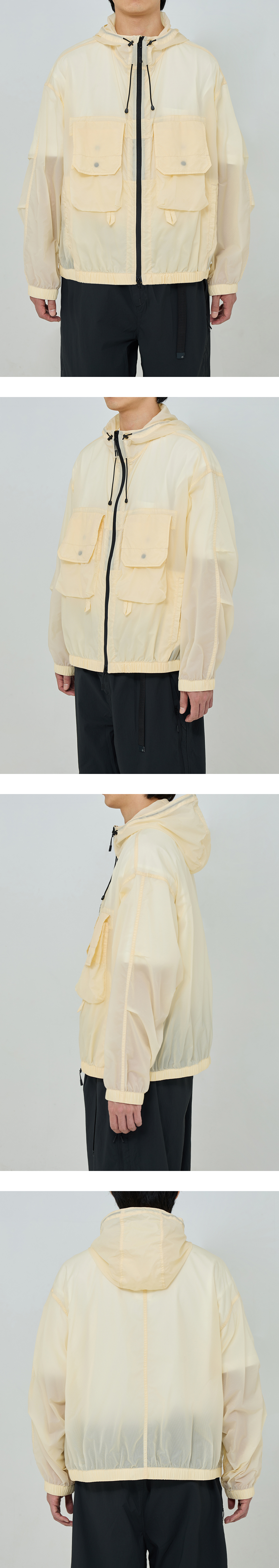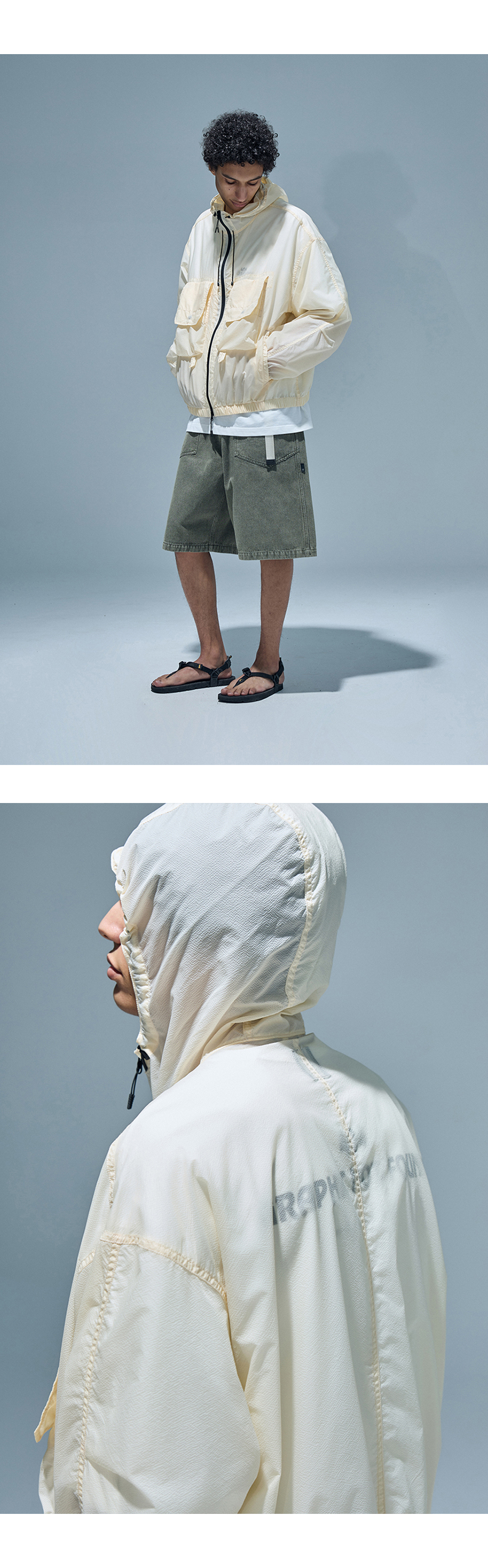 빈티지 피싱 웨어를 베이스로 한 후드 파카 · 넉넉한 느낌의 루즈한 실루엣. · 가볍고 바스락거리는 립스탑 나일론 원단 사용. · 투웨이 지퍼를 사용한 앞여밈 사양. · 사이드 웰트 포켓과 넉넉한 사이즈의 패치 포켓 사양. · 입구 부분 둘레 조절이 가능한 후드 스트링 사양. · 신축성 있는 이밴드가 내장되어 있는 밑단과 소매 커프스 사양. · 소매에 두 개의 턱을 사용하여 편안한 착용감과 풍성한 실루엣 연출.