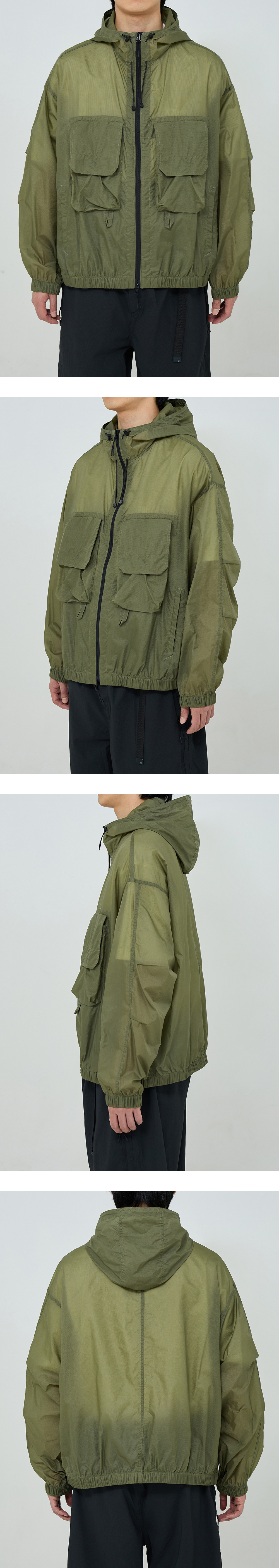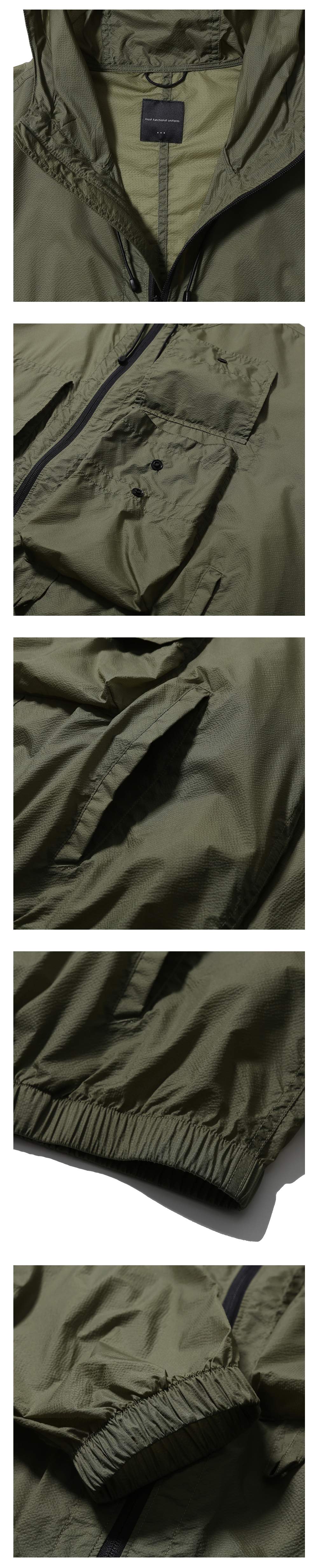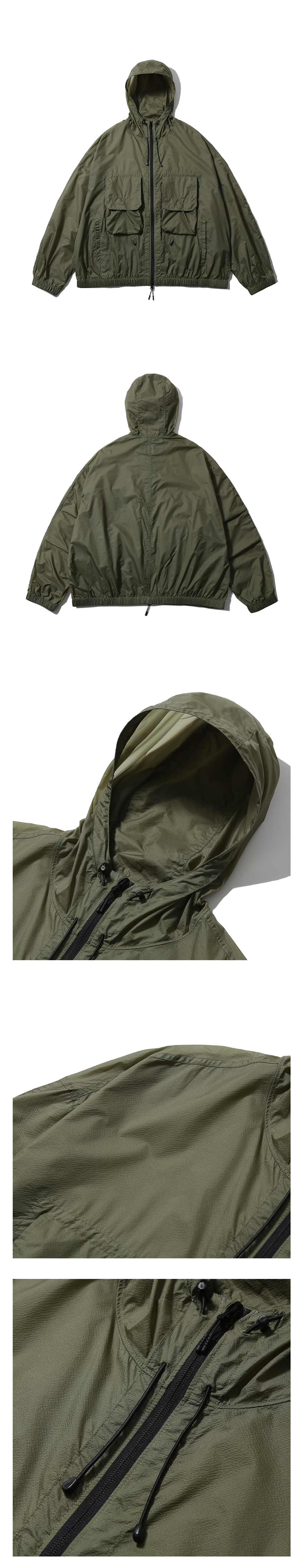 빈티지 피싱 웨어를 베이스로 한 후드 파카 · 넉넉한 느낌의 루즈한 실루엣. · 가볍고 바스락거리는 립스탑 나일론 원단 사용. · 투웨이 지퍼를 사용한 앞여밈 사양. · 사이드 웰트 포켓과 넉넉한 사이즈의 패치 포켓 사양. · 입구 부분 둘레 조절이 가능한 후드 스트링 사양. · 신축성 있는 이밴드가 내장되어 있는 밑단과 소매 커프스 사양. · 소매에 두 개의 턱을 사용하여 편안한 착용감과 풍성한 실루엣 연출.