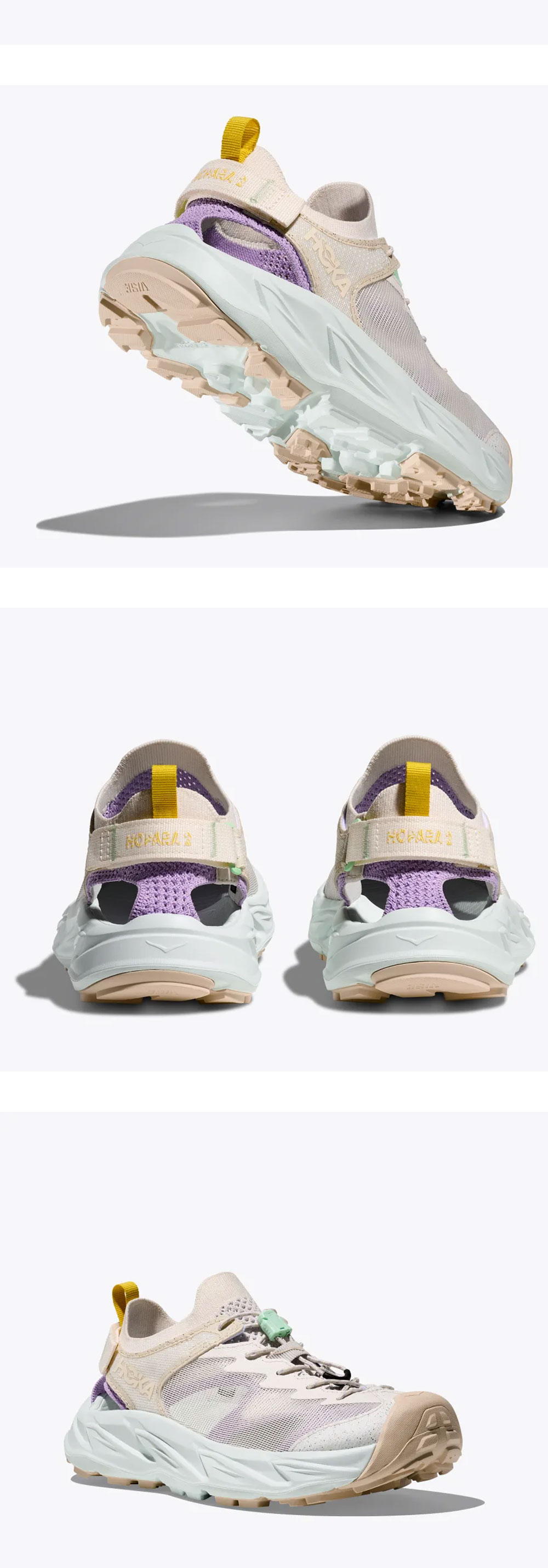 파스텔 톤의 색조합이 매력적인 호카의 우먼 호파라 2 앨러배스터 스노우 멜트입니다. - 빠른 이동 시에도 발끝 동작의 반발력을 유지하면서 안정적인 쿠션감 - 방수 처리된 100% 재생 니트 어퍼로 향상된 습기 관리 기능으로 가벼운 착용감 - 힐 스트랩으로 핏 조절 가능 - 퀵 토글 레이스로 신고 벗기 쉽고, 발은 항상 안정적으로 고정 가능 - 견고한 러버 아웃솔로 습하고 건조한 환경에서 탁월한 접지력 제공