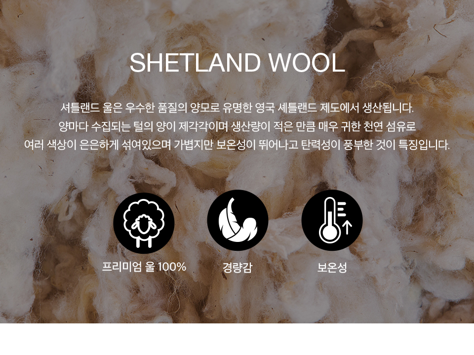 100% 파인 소프트 셔틀랜드 울 원단을 사용하여 제작된 니트웨어입니다. 양모를 브러쉬 가공 및 실리콘 유연제 처리하여 거친 터치감을 보완하였고 부슬부슬한 헤어감이 느껴지는 양모 특유의 텍스처로 포근하며, 공기층이 잘 형성되어 가벼우면서도 보온성이 뛰어납니다. 다양한 색상의 원사를 믹스하여 오묘하고 고급스러운 느낌을 주고 전체 사시 봉제로 편직하여 더욱 편안하게 착용 가능하며 오픈 클로징이 가능한 소매의 단추 디테일로 유니크한 무드를 더했습니다. 베이직한 라운드넥 디자인에 레귤러 핏으로 깔끔한 실루엣을 연출해 주며 전면 가슴 부분의 로고 각인 금속 라벨로 포인트를 주었습니다. * 셔틀랜드 울 특유의 소재감으로 인해 까끌까끌함을 느낄 수 있어 이너와 함께 착용을 권장합니다.