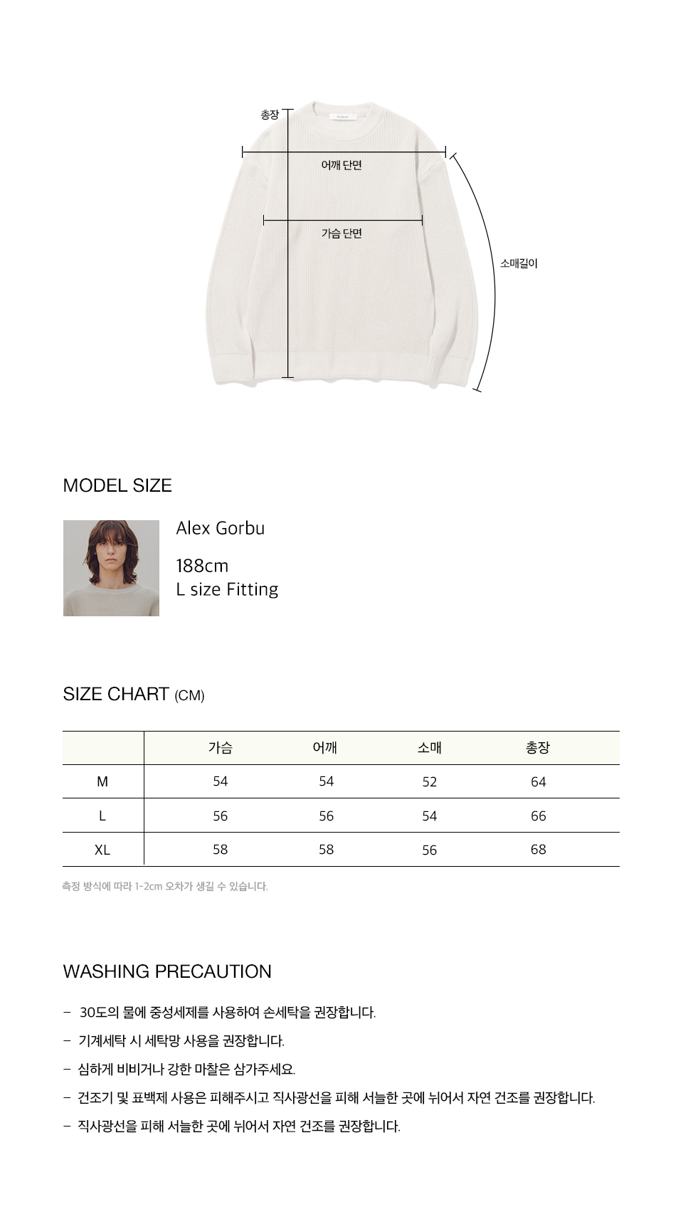 고급 소프트 코튼 원단으로 맨살에 입어도 부드러운 촉감을 느낄 수 있으며 기계세탁하여도 변형되지 않는 내구성을 가지고 있는 제품입니다. 노컷팅 자동 패턴으로 제작되어 자연스러운 드랍 숄더로 착용 시 흐르듯이 떨어지는 실루엣을 연출해줍니다. 톤 다운된 차분한 컬러로 구성되어 부담 없이 착용 가능하며 데님 팬츠, 슬랙스 등 다양한 팬츠와 매치하기 좋아 활용도 높은 니트웨어입니다.