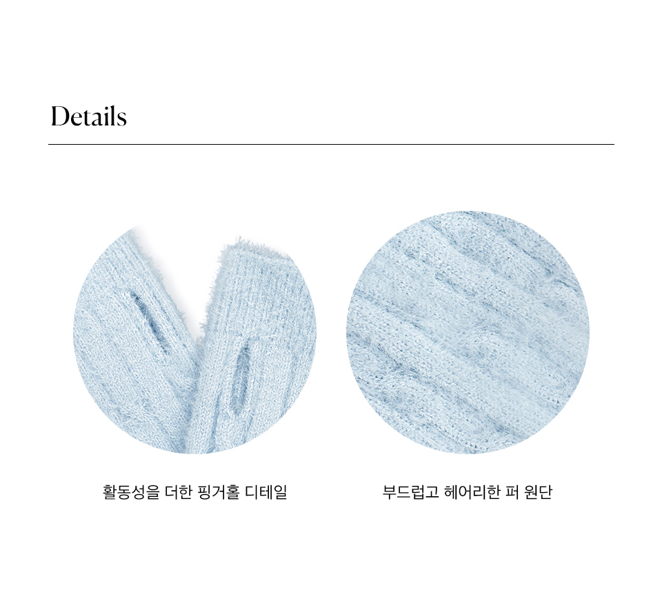 부드럽고 헤어리한 퍼 원사로 제작되어 특유의 입체감과 포근한 무드가 돋보이는 핸드워머입니다. 터치감이 매우 부드러워 착용 시 편안하고 위 아래 립 조직으로 흘러내림을 최소화 하였습니다. 핑거리스 디자인으로 활동성과 보온성을 모두 겸비하였으며 넉넉한 길이감으로 매치하는 상의에 알맞게 조절하여 착용 가능합니다.