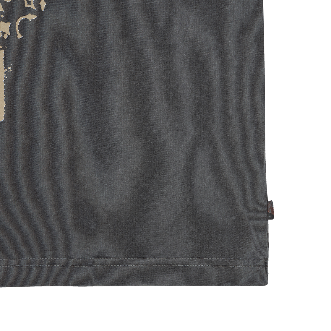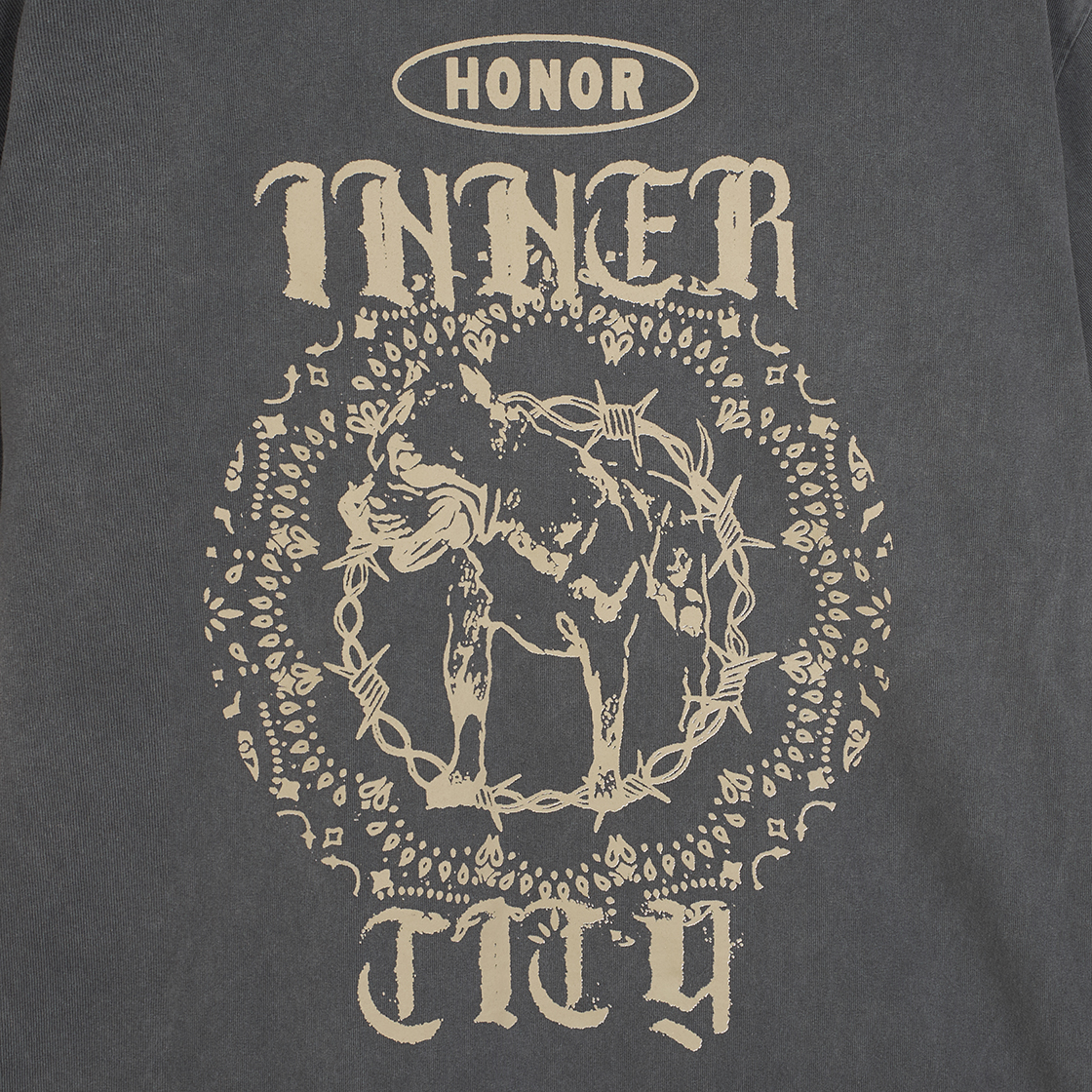빈티지 워싱된 그레이 컬러감이 매력적인 오너더기프트의 바브드 와이어 핏불 숏슬리브 티 다크 그레이입니다. - 프리미엄 크루넥 티셔츠 - 빈티지 워싱 - HTG® 직조 라벨 - 면 100%