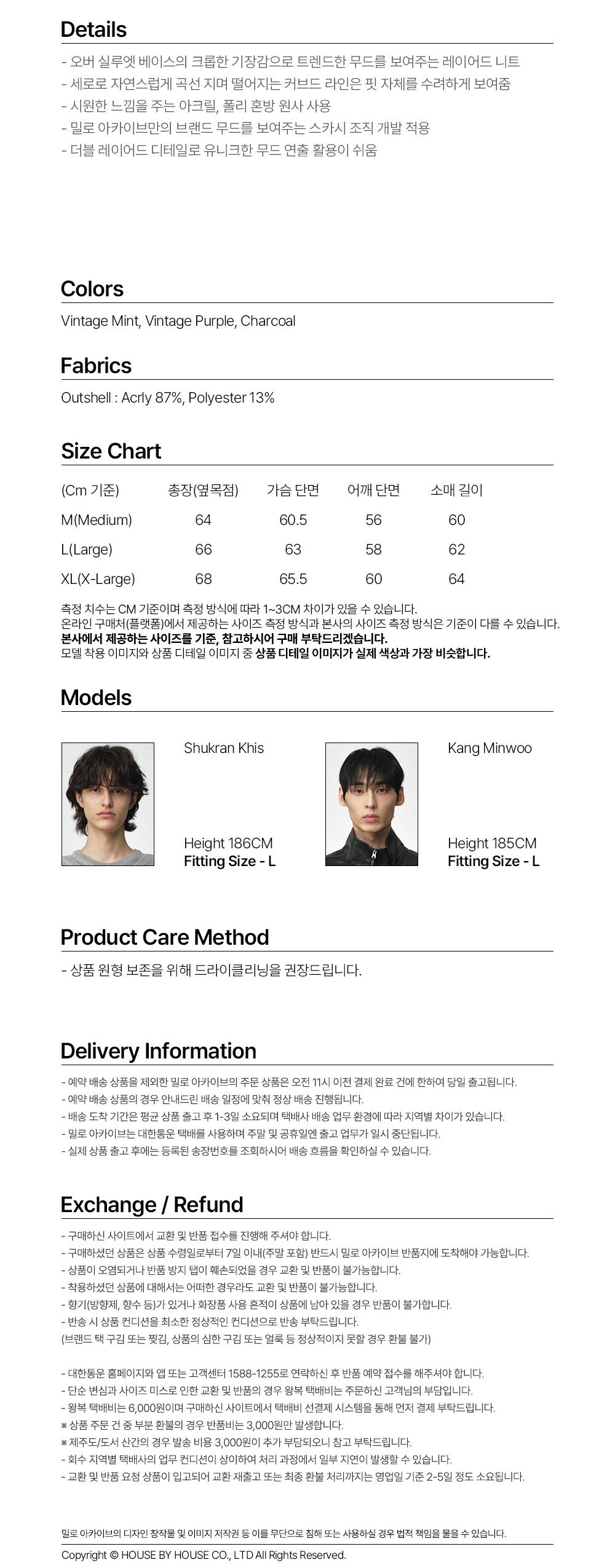 - 오버 실루엣 베이스의 크롭한 기장감으로 트렌드한 무드를 보여주는 레이어드 니트 - 세로로 자연스럽게 곡선 지며 떨어지는 커브드 라인은 핏 자체를 수려하게 보여줌 - 시원한 느낌을 주는 아크릴, 폴리 혼방 원사 사용 - 밀로 아카이브만의 브랜드 무드를 보여주는 스카시 조직 개발 적용 - 더블 레이어드 디테일로 유니크한 무드 연출 활용이 쉬움