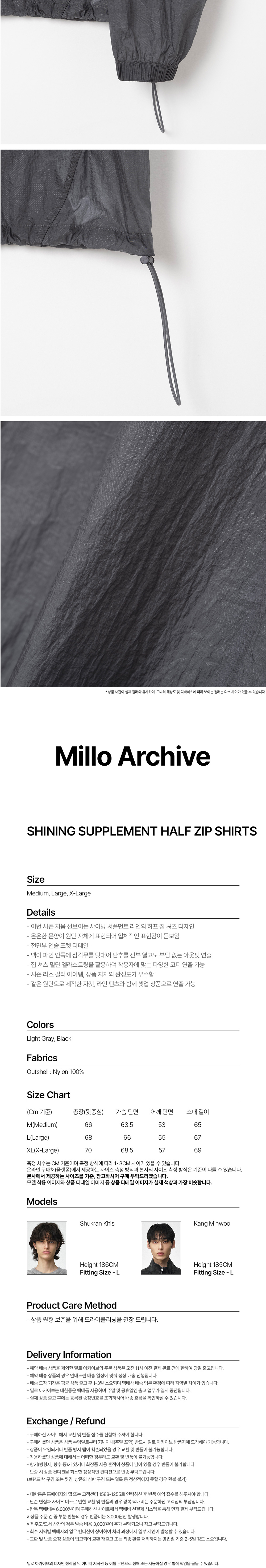 - 이번 시즌 처음 선보이는 샤이닝 서플먼트 라인의 하프 집 셔츠 디자인 - 은은한 문양이 원단 자체에 표현되어 입체적인 표현감이 돋보임 - 전면부 입술 포켓 디테일 - 넥이 파인 안쪽에 삼각무를 덧대어 단추를 전부 열고도 부담 없는 아웃핏 연출 - 집 셔츠 밑단 엘라스트링을 활용하여 착용자에 맞는 다양한 코디 연출 가능 - 시즌 리스 컬러 아이템, 상품 자체의 완성도가 우수함 - 같은 원단으로 제작한 자켓, 라인 팬츠와 함께 셋업 상품으로 연출 가능