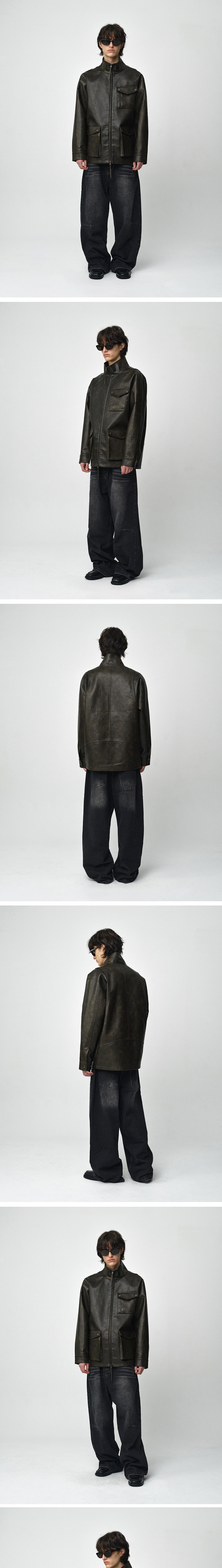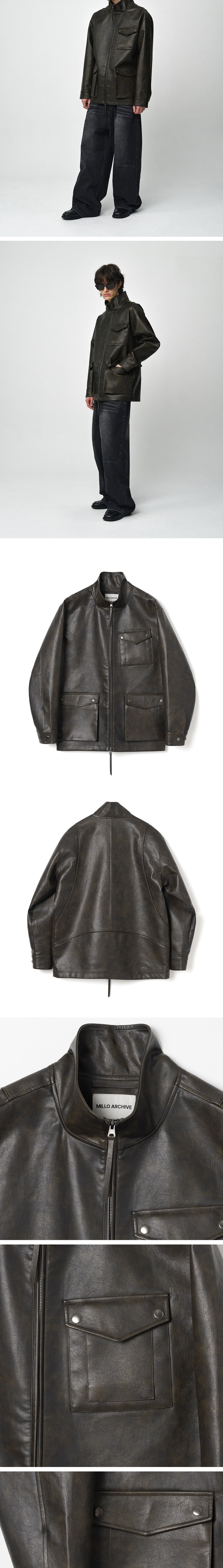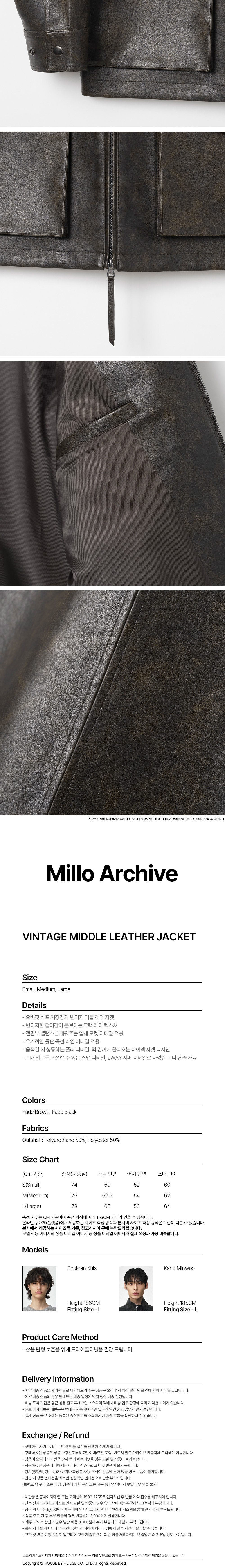 - 오버핏 하프 기장감의 빈티지 미들 레더 자켓 - 빈티지한 컬러감이 돋보이는 크랙 레더 텍스쳐 - 전면부 밸런스를 채워주는 입체 포켓 디테일 적용 - 유기적인 등판 곡선 라인 디테일 적용 - 움직일 시 생동하는 풀러 디테일, 턱 밑까지 올라오는 하이넥 자켓 디자인 - 소매 입구를 조절할 수 있는 스냅 디테일, 2WAY 지퍼 디테일로 다양한 코디 연출 가능