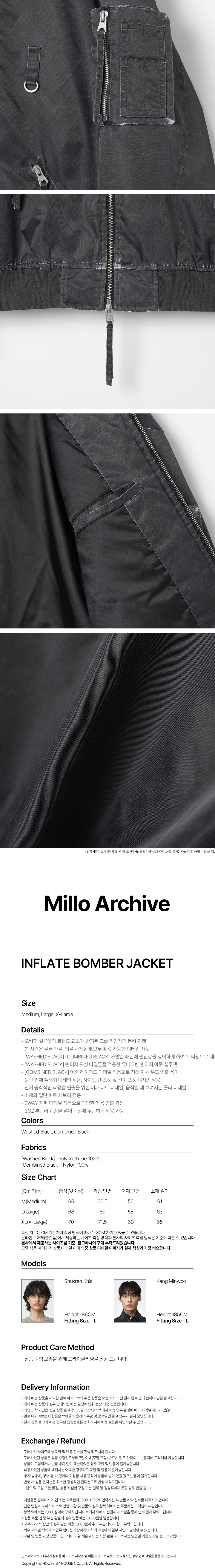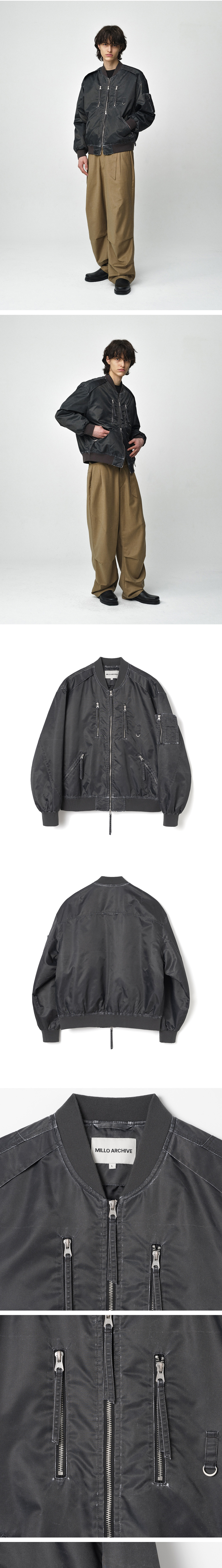 - 오버핏 실루엣의 트렌드 요소가 반영된 크롭 기장감의 봄버 자켓 - 봄 시즌은 물론 가을, 겨울 사계절에 모두 활용 가능한 디테일 자켓 - [WASHED BLACK] [COMBINED BLACK] 개발한 패턴에 원단감을 상이하게 하여 두 타입으로 제작 - [WASHED BLACK] 빈티지 워싱 나일론을 적용한 유니크한 빈티지 아웃 실루엣 - [COMBINED BLACK] 이중 레이어드 디테일 적용으로 자켓 자체 무드 연출 용이 - 등판 입체 플레쉬 디테일 적용, 사이드 펜 포켓 및 간이 포켓 디자인 적용 - 인체 공학적인 착용감 연출을 위한 어깨 다트 디테일, 움직일 때 보여지는 풀러 디테일 - 소매와 밑단 파트 시보리 적용 - 2WAY 지퍼 디테일 적용으로 다양한 착용 연출 가능 - 3OZ 부드러운 솜을 넣어 계절에 무관하게 착용 가능