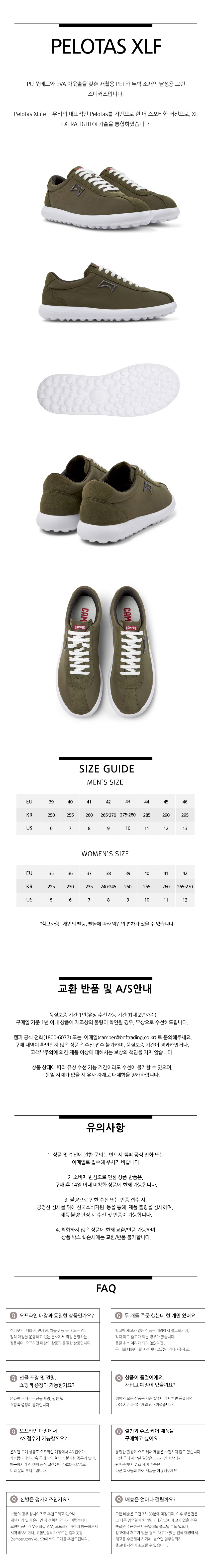 캠퍼 남성 펠로타스 XLF 스니커즈 카키