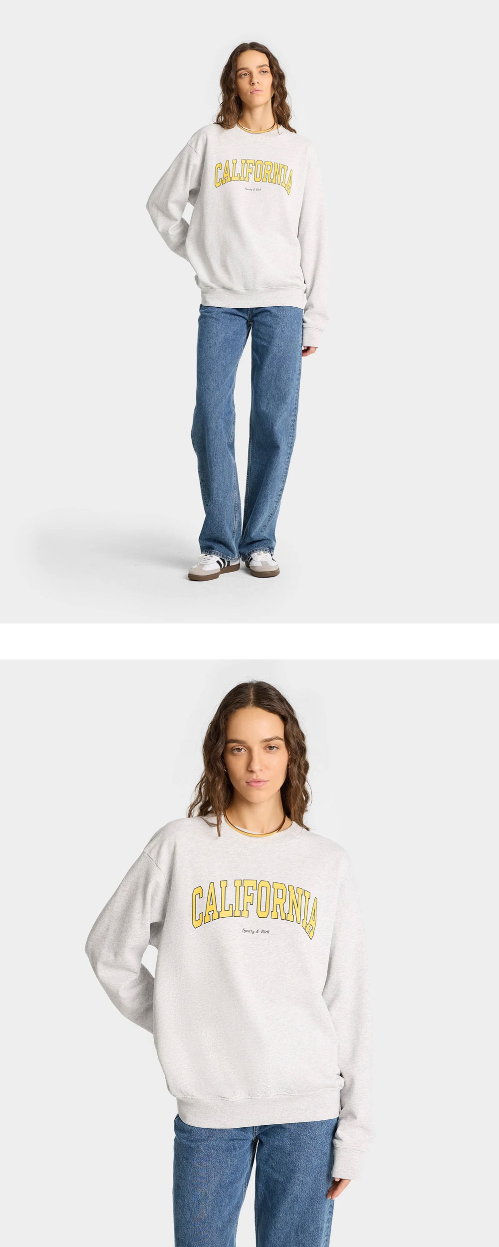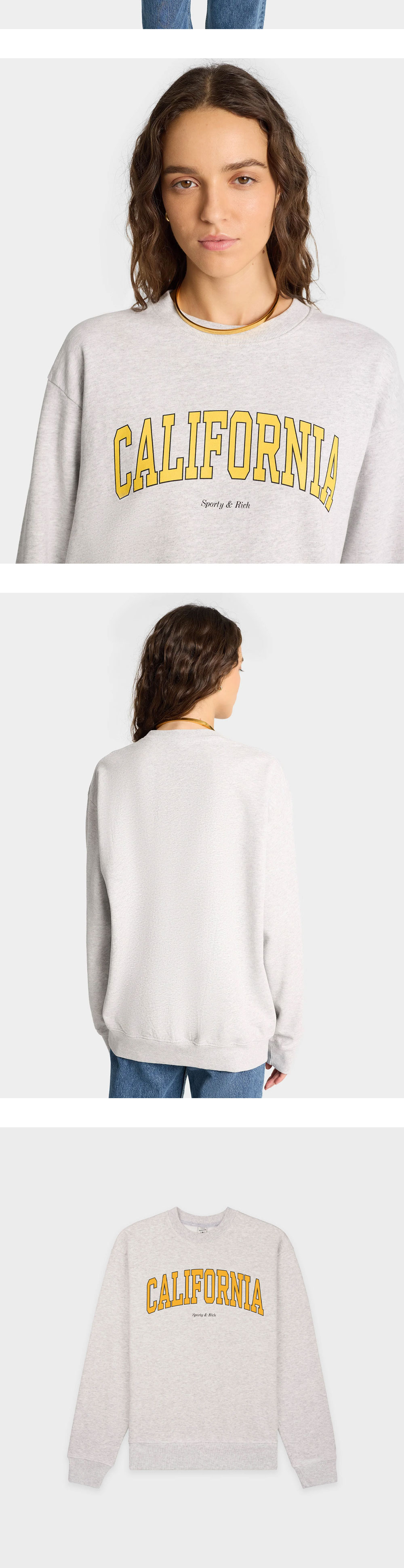 깔끔한 디자인이 매력적인 스포티 앤 리치의 캘리포니아 크루넥 헤더 그레이입니다. - 세미 오버핏 - 면 97%, 폴리에스테르 3% - 11.5 oz - Made in the USA * 모델: 176cm, S 착용