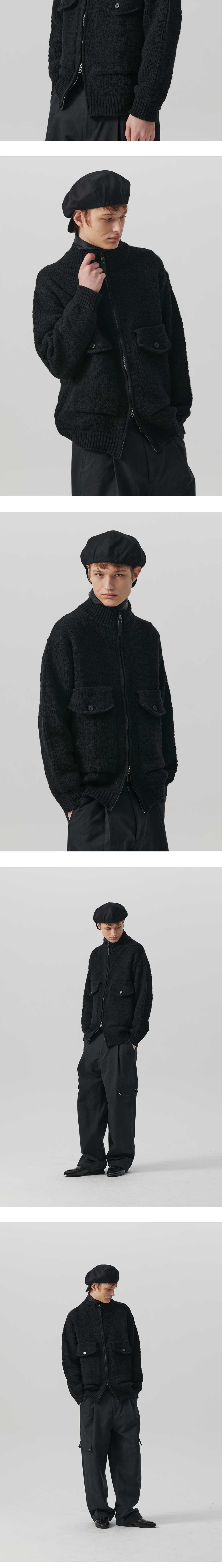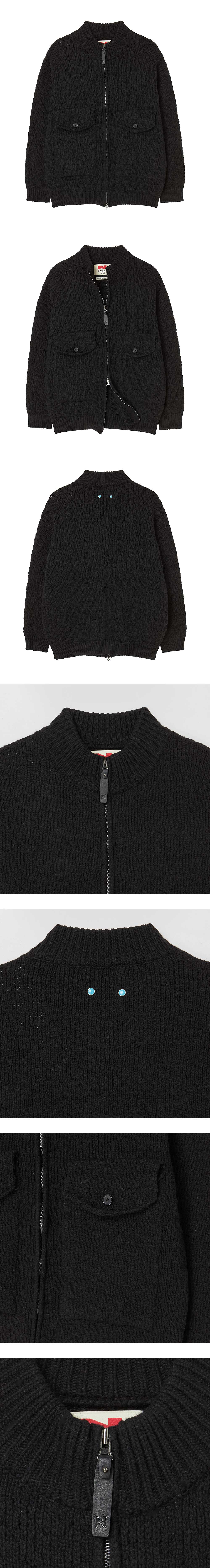ㆍ한정 수량으로 제작된 컬렉션 라인의 니트 점퍼 ㆍ램스 울 혼방 원사로 제작된 세미 오버핏의 니트 점퍼 ㆍTUCK SOLID 형태로 편직한 조직으로 클래식하고 빈티지한 무드 연출 ㆍ2-WAY 지퍼 사용으로 다양한 스타일링 연출 가능 ㆍ컬렉션 라인의 로고가 불박 각인된 빈티지 레더 고리 장식 디테일 ㆍ램스울 특유의 자연스럽고 부드러운 터치감 ㆍ앞 포켓 여밈 천연 소뿔 단추로 오리지널리티 디테일 ㆍ뒷면에 빈티지 가공된 터키석 장식 디테일 ㆍ남녀공용 착용