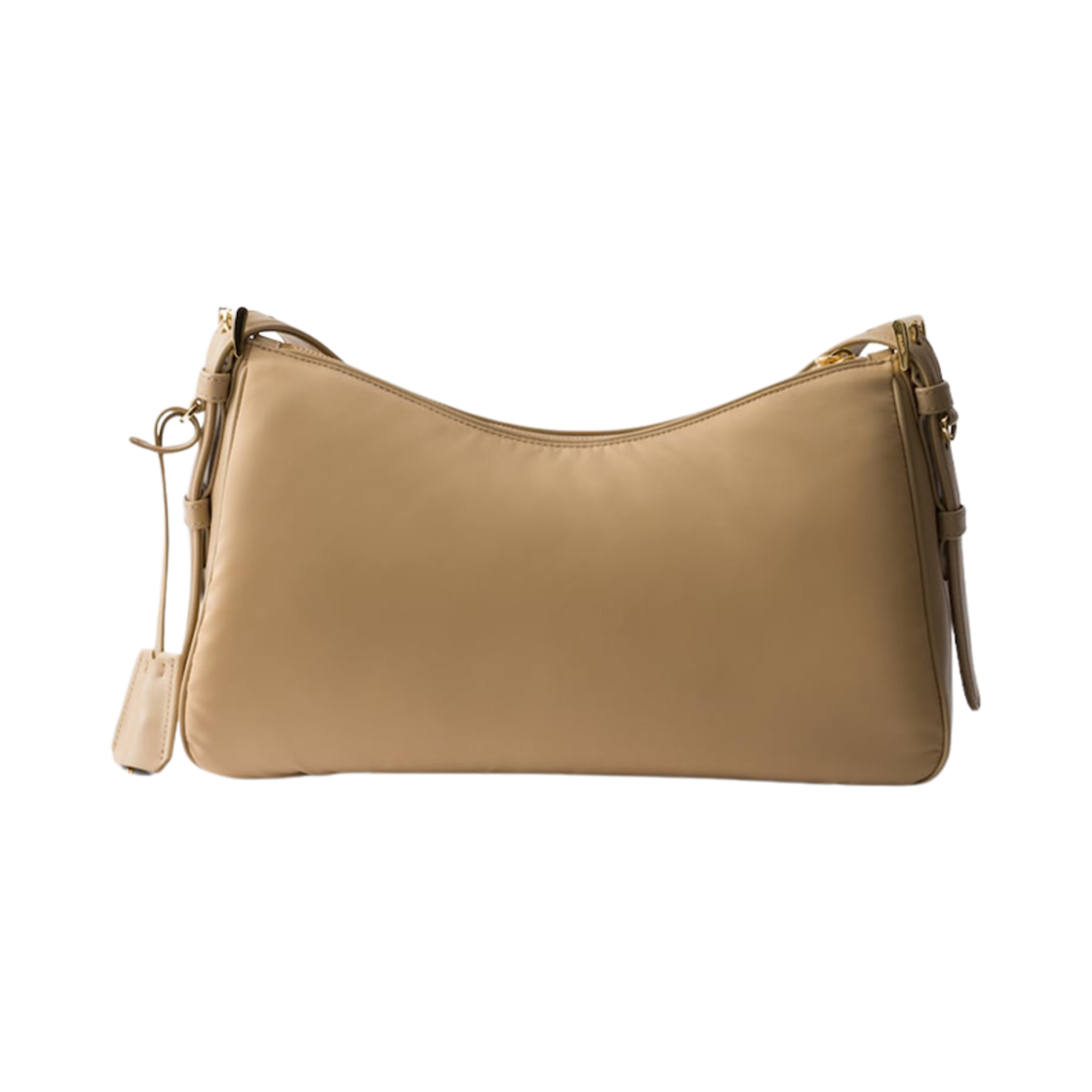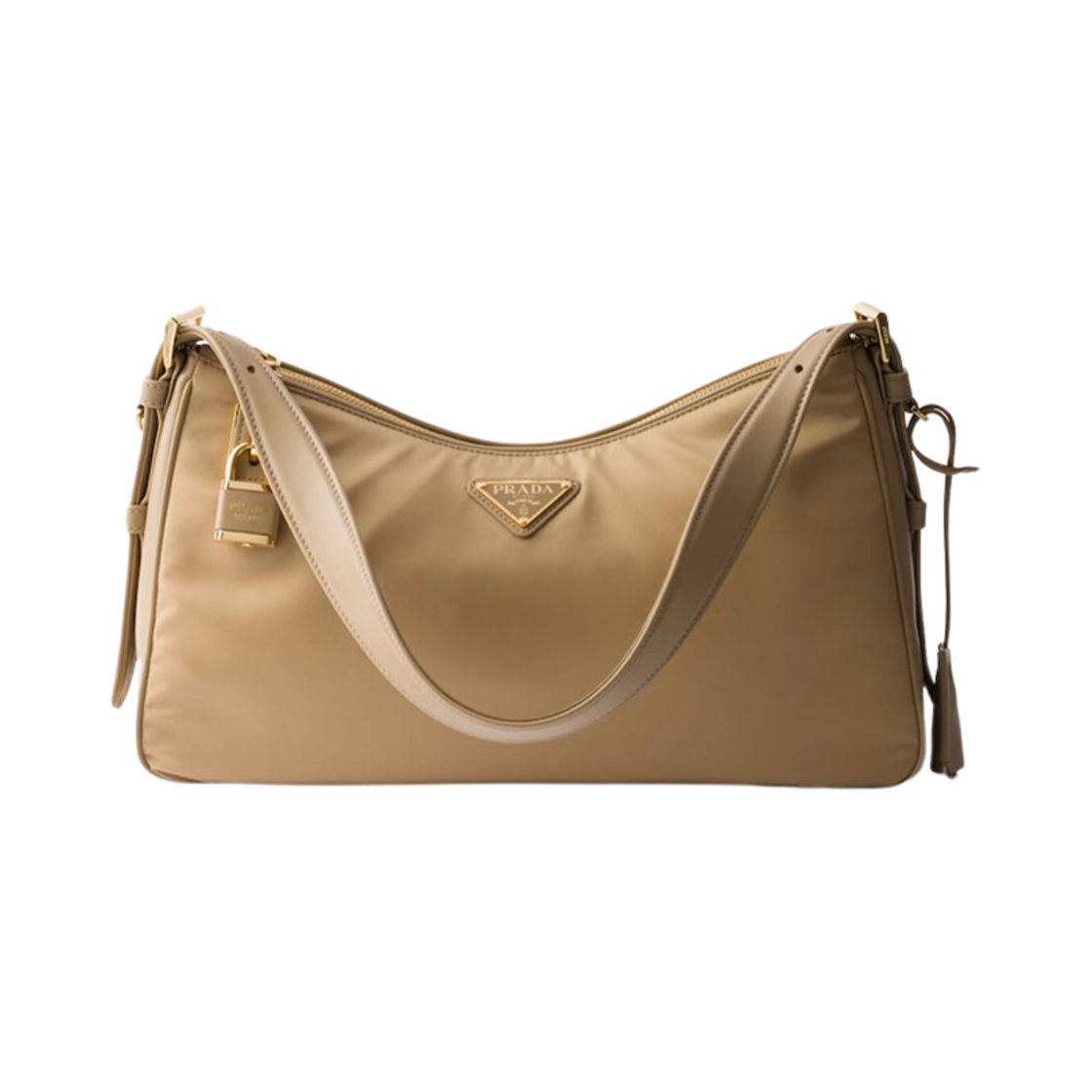 Prada Aimee Large Re-Nylon and Leather Shoulder Bag with Padlock Camel Brown