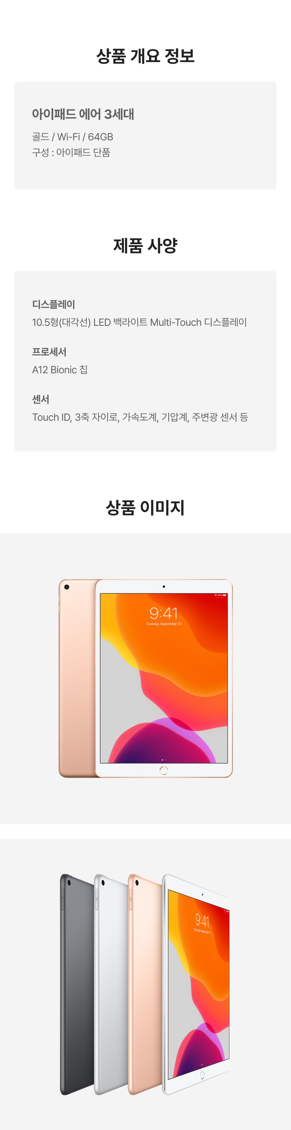 [B등급] 리퍼비시 아이패드 에어 3세대 wifi A12 Bionic 64기가 골드