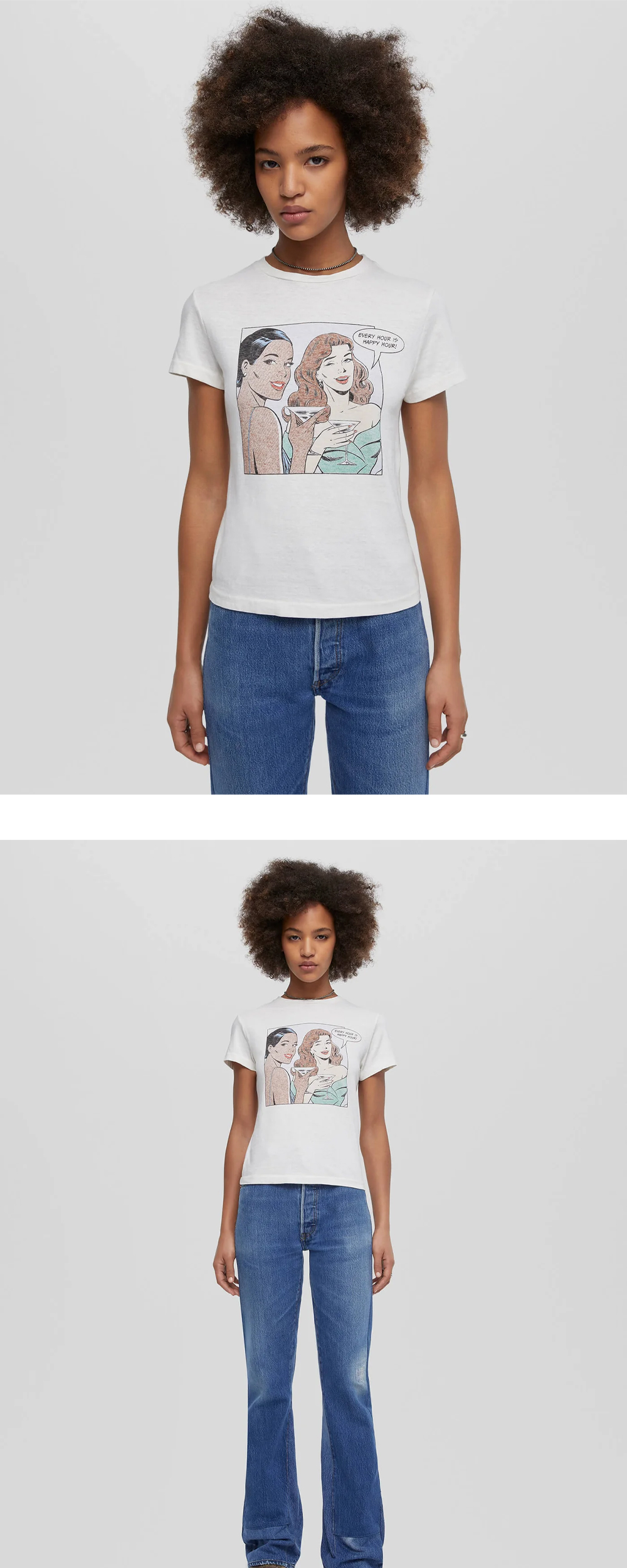 빈티지 코믹 북 그래픽이 새겨진 리던의 우먼 클래식 티 해피 아워입니다. - 재활용 면 사용 - 수집 가능한 빈티지에서 영감 받은 그래픽 * 모델 S 사이즈 착용